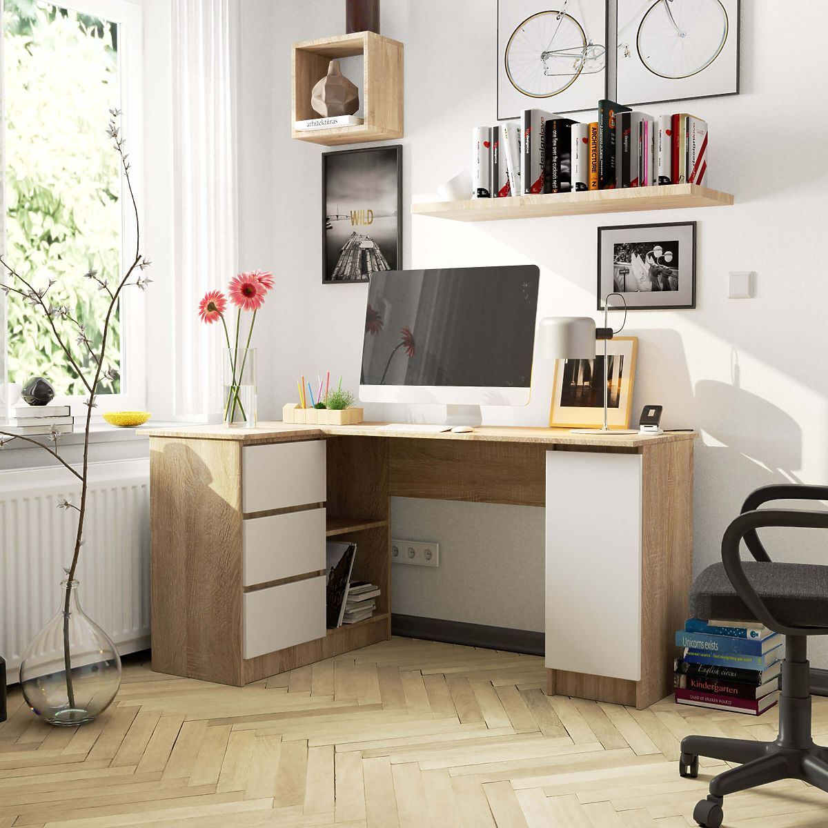 Eck-Computertisch mit Schubladen und Schrank - B20 - Sonoma Eiche mit weißer Front