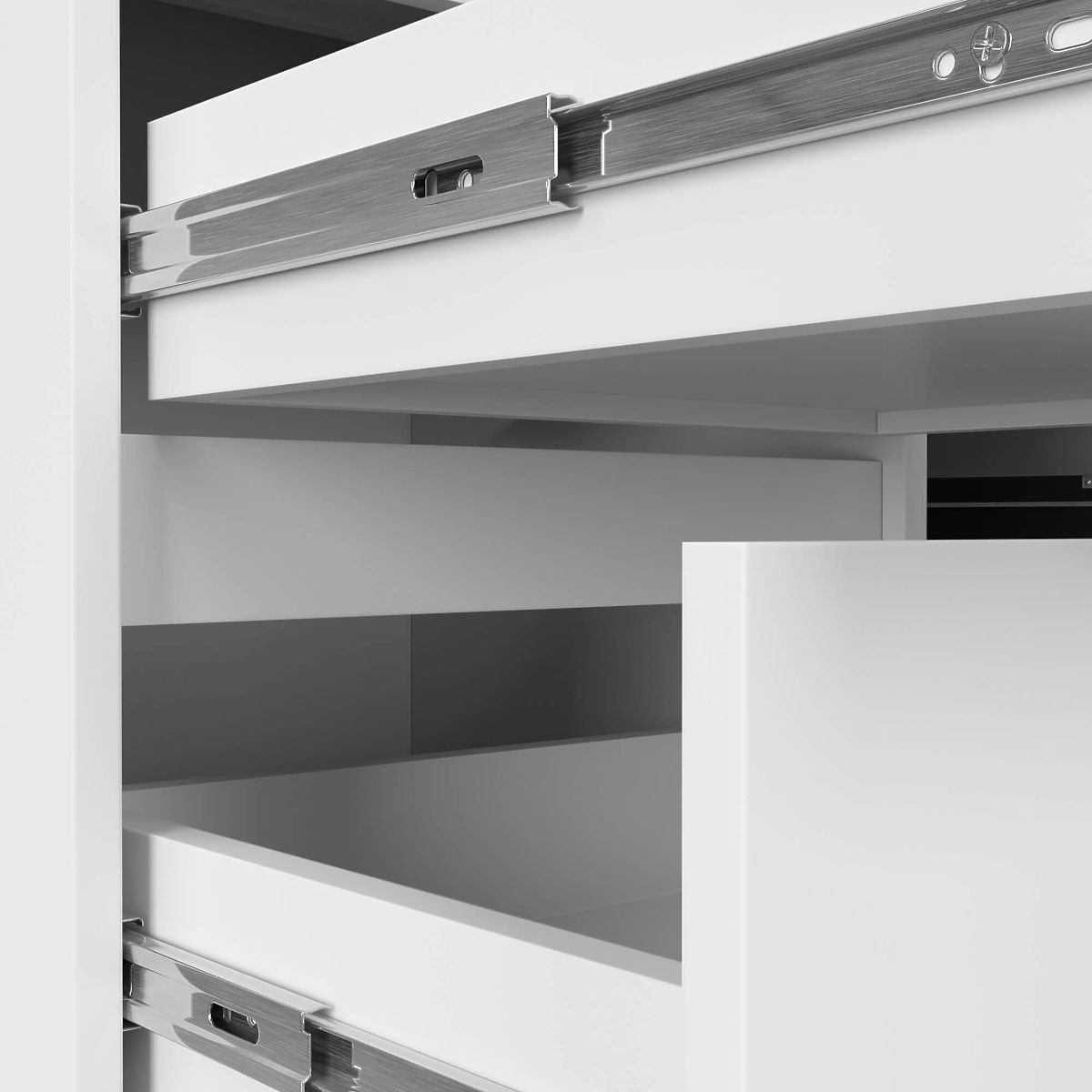 - Schubladen bewegen sich auf Metallkugelführungen