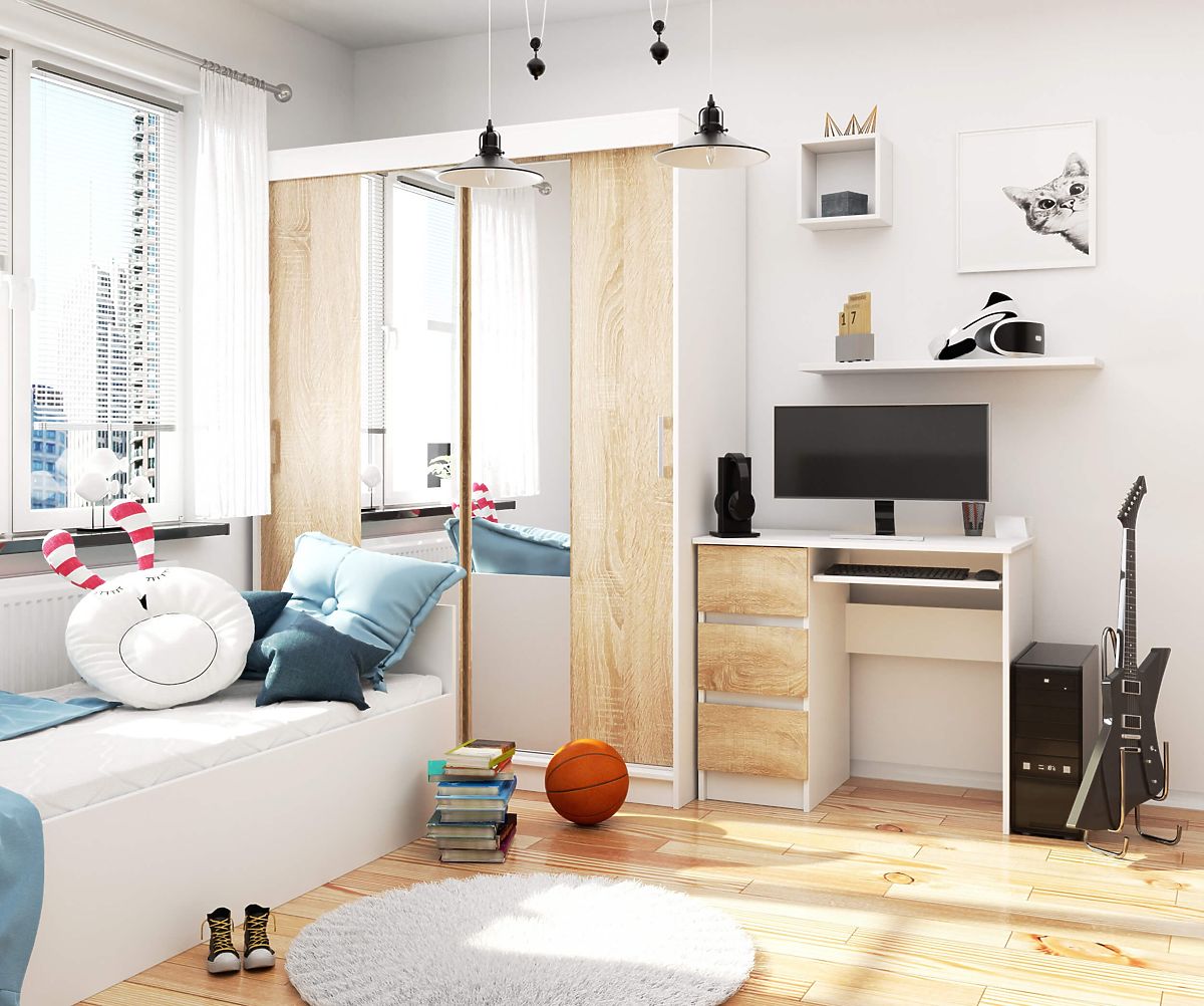 Die Farbe des Tisches ist Weiß, außer den Schubladenfronten, die in der Farbe Eiche Sonoma gehalten sind. Dadurch hebt er sich durch seine Originalität hervor, insbesondere vor dem Hintergrund einfarbiger Möbel. Er passt ideal in Innenräume mit minimalistischem Design. Der Tisch zeichnet sich durch eine hohe Langlebigkeit aus. Wir bieten eine Garantiezeit von 24 Monaten. Computernutzer werden die Funktionalität und die hohe Qualität des präsentierten Tisches sicherlich zu schätzen wissen.