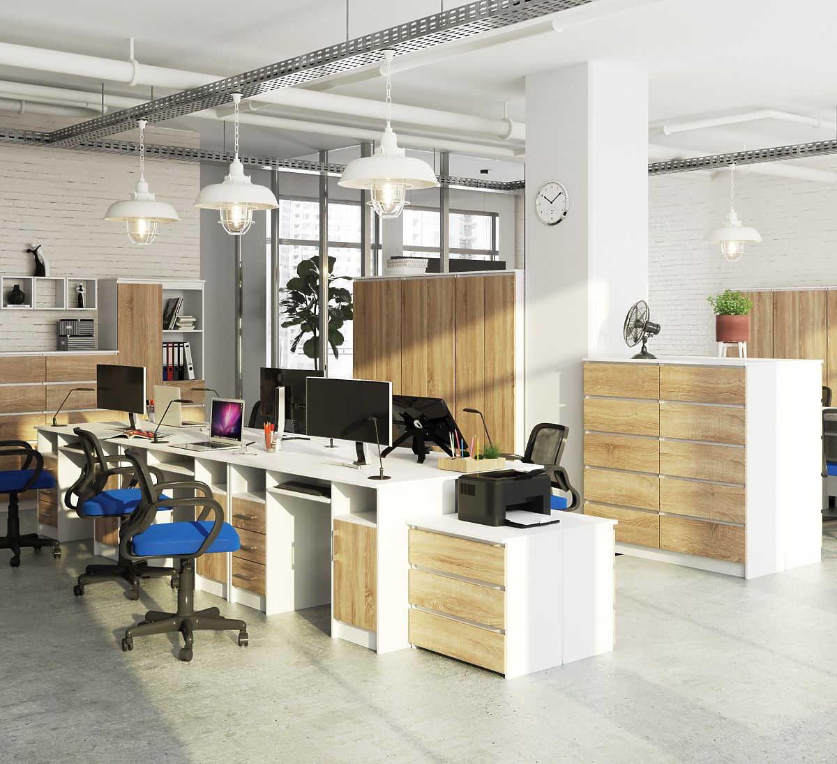 Hergestellt aus abriebfestem laminiertem Plattenmaterial. Die Platte, Seiten und Fronten sind mit ABS-Kante versehen. Er verfügt über eine ausziehbare Tastaturablage, 3 Schubladen und eine Tür mit Fronten aus laminiertem Plattenmaterial.