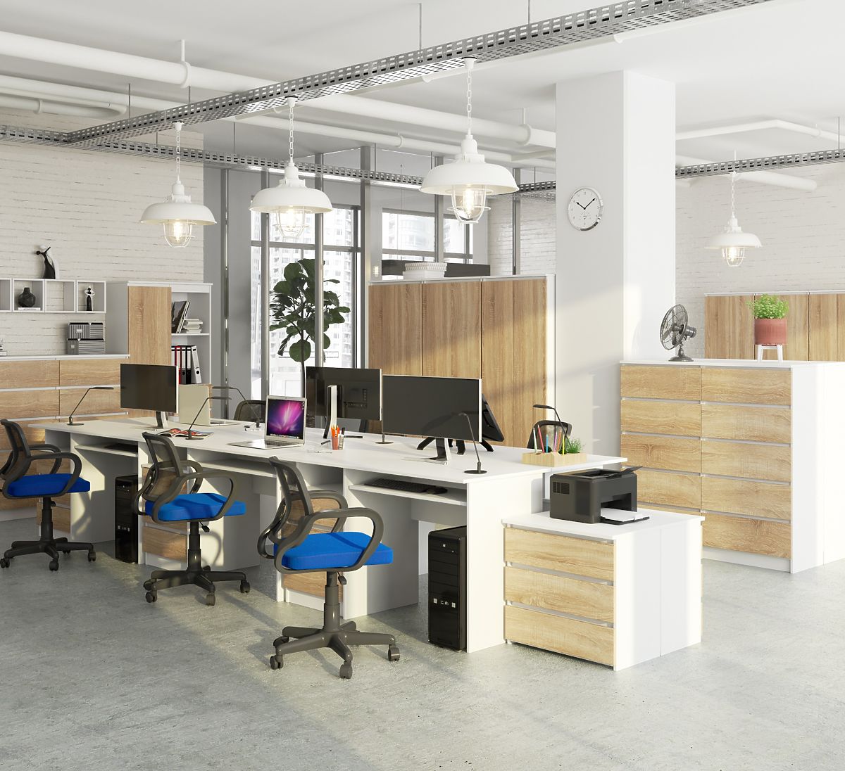 Schreibtisch aus weißem und Sonoma-laminiertem Material mit vielen Nutzungsmöglichkeiten. .. mehr