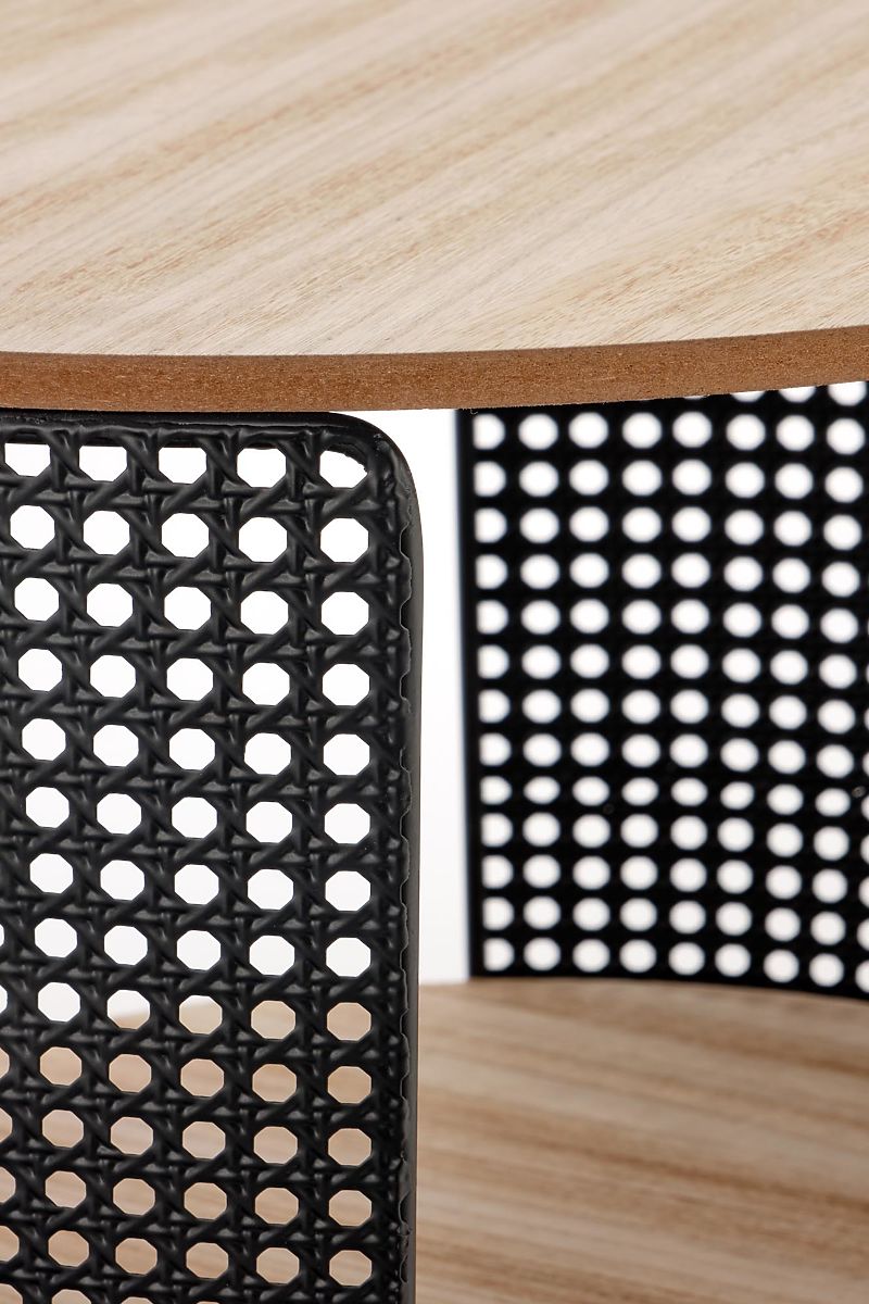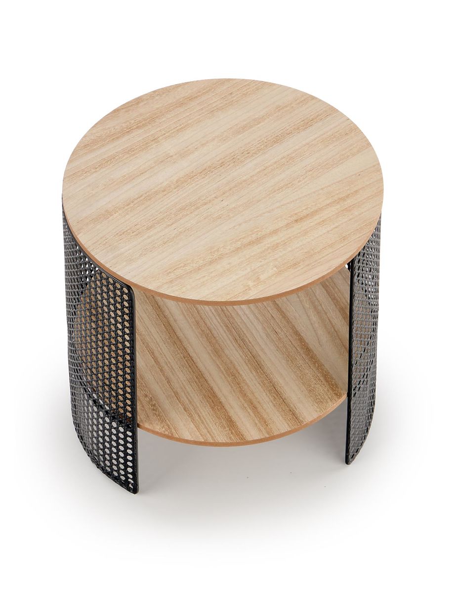 Der Couchtisch Trafica ist ein modernes Möbelstück, das durch seine originelle Konstruktion und Liebe zum Detail besticht. Er ist für Liebhaber praktischer, aber gleichzeitig ästhetisch ausgefeilter Lösungen konzipiert, die dem Interieur einen individuellen Charakter verleihen. Das dominierende Element des Tisches sind Stahlbeine mit Pulverbeschichtung, deren ungewöhnliche Textur mit feinen Perforationen einen markanten visuellen Effekt erzeugt. Diese Details verleihen dem Tisch einen modernen industriellen Touch und machen ihn zu einem auffälligen Accessoire im Wohnzimmer oder Entspannungsbereich. Die runde Tischplatte besteht aus MDF-Platte mit natürlichem Furnier und sichtbarer Holzmaserung, die Wärme und eine gemütliche Atmosphäre in den Raum bringt. Ein praktischer Vorteil ist das zusätzliche untere Regal, ideal zum Ablegen von Büchern, Zeitschriften oder Kleinigkeiten, die Sie beim Entspannen immer griffbereit haben möchten. Dank seiner kompakten Abmessungen passt der Couchtisch Trafica nicht nur in Wohnzimmer, sondern auch in kleinere Räume, Leseecken oder moderne Entspannungsbereiche. Er vereint Funktionalität, modernes Design und den natürlichen Look der Materialien zu einem harmonischen Ganzen.
