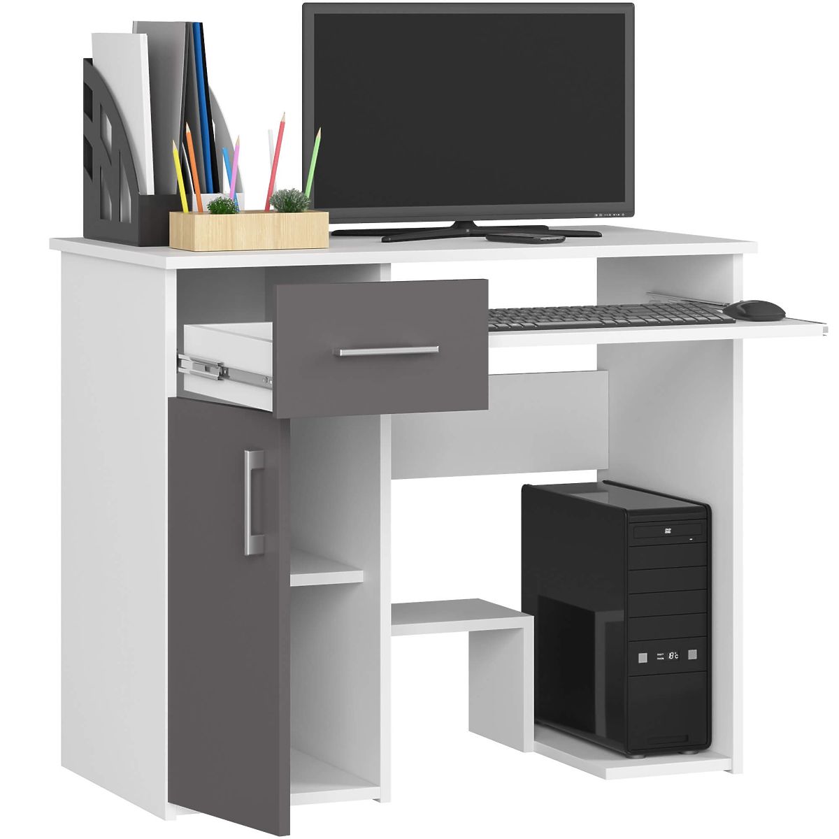 Müssen hochwertige Computertische teuer sein? Nicht unbedingt! Ein Beispiel ist der Schreibtisch JAY 90 cm in Weiß mit Frontflächen in Graphitgrau. Es ist ein funktionales Möbelstück, das die Organisation von Arbeit und Studium vor dem Computerbildschirm erleichtert. Es passt hervorragend ins Wohnzimmer, Jugendzimmer oder Büro, wo es durch seine hohe ästhetische Ausführung besticht.