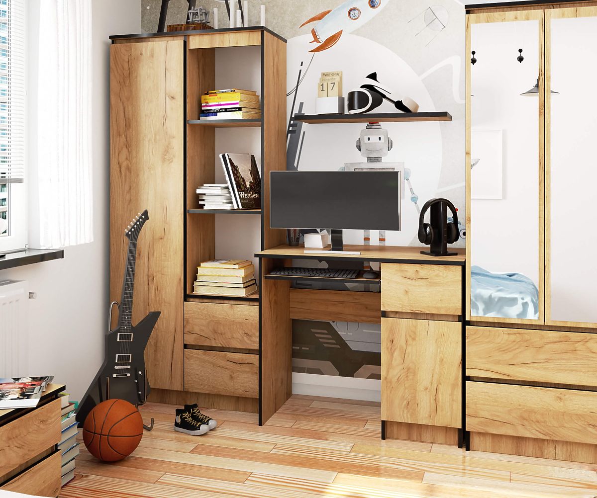 Der Computertisch PIKSEL 90 cm in der Farbe Eiche Craft eignet sich ideal für kleine Innenräume. Er bewährt sich auch hervorragend als Schreibtisch für Schüler oder als Tisch im Hotelzimmer. Obwohl er klein ist, verfügt er über eine praktische seitliche Schublade und einen Schrank mit Regal, in dem Hefte, Ordner und Bücher problemlos Platz finden. Auf dem Tisch lässt sich leicht ein Computermonitor platzieren und die Tastatur kann auf einem ausziehbaren Regal untergebracht werden. Der Computertisch PIKSEL ist aus einer angenehm zu berührenden und pflegeleichten laminierten Platte gefertigt, die abriebfest ist. Die glatte Oberfläche der Fronten verleiht dem Ganzen einen eleganten Charakter.