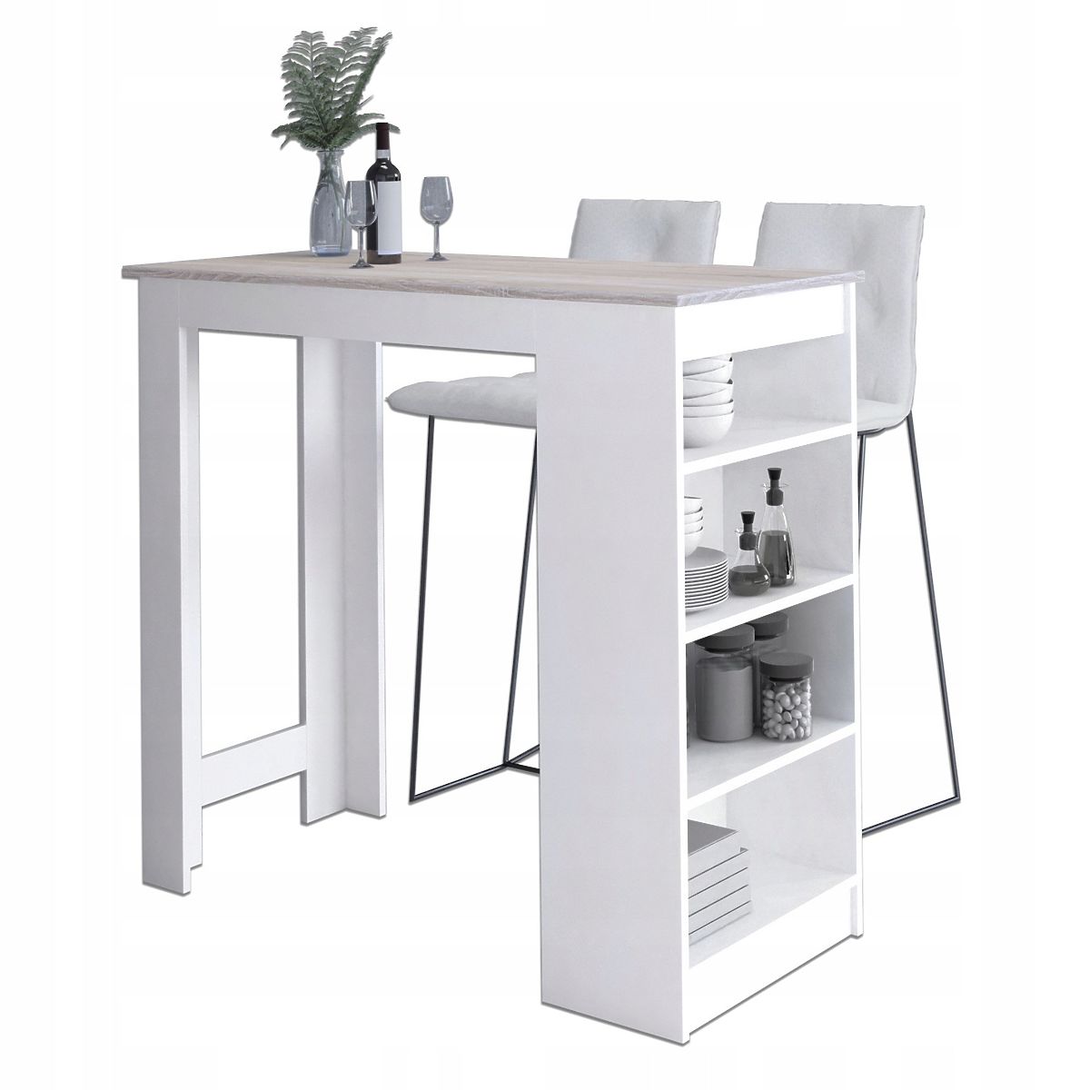 Der Bartisch für Barhocker, erhältlich im Akord-Shop, in Weiß gehalten mit einer Sonoma Eiche Platte, passt perfekt in Räume mit unterschiedlichen Wandfarben, Böden oder anderen Ausstattungsmerkmalen. An seiner Außenseite befinden sich Regale, auf denen Geschirr und weiteres Zubehör bequem aufbewahrt werden können. Die Anpassung des Tisches an das CLP-Möbelsystem ermöglicht es, jede beliebige Anordnung zu schaffen, die dem Projekt oder den Bedürfnissen des Wohnungsbesitzers entspricht.