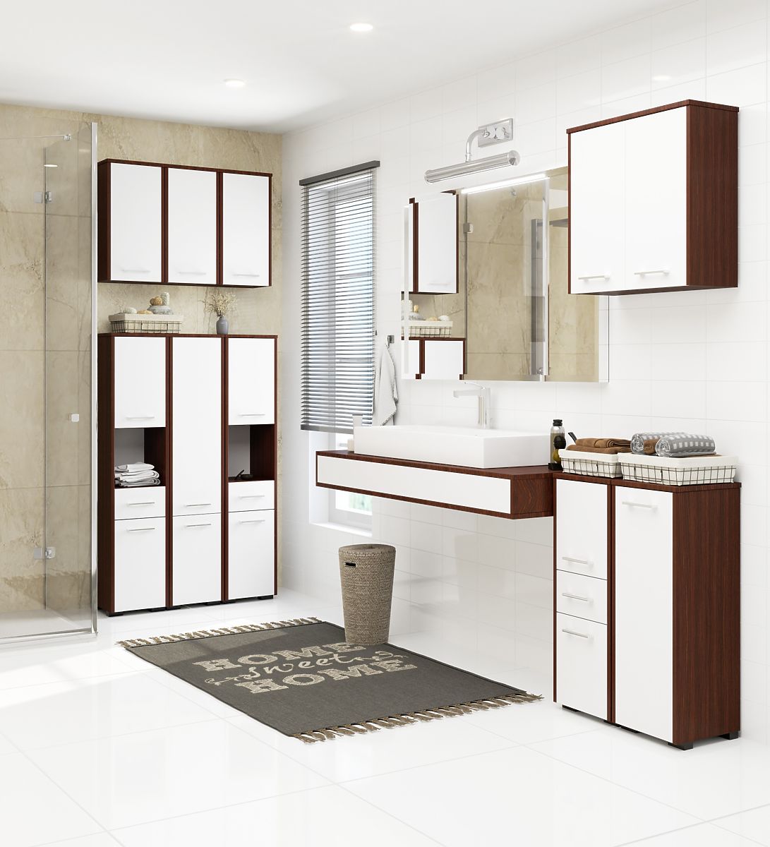 Auch in einem kleinen Badezimmer können Bedingungen für die bequeme Aufbewahrung von Reinigungsmitteln oder Kosmetika geschaffen werden. Es reicht aus, dafür geeignete Möbel zu verwenden. Der Badezimmerschrank über der Waschmaschine ist eine großartige Lösung, um den oft ungenutzten Raum über diesem Gerät zu nutzen. Bestehend aus Schrank und Regalen, wird dieses Möbelstück eine unschätzbare Hilfe bei der Einrichtung des Badezimmers sein. Im Schrank können wir leicht Waschpulver, Flüssigkeiten und andere Hygieneartikel aufbewahren. Die Regale können als Platz für Handtücher oder Behälter mit Badezimmerzubehör dienen. Weiße Türen kombiniert mit einem Korpus in Wengefarbe sind eine sehr raffinierte Kombination, die dem Raum einen modernen Stil verleiht. Darüber hinaus sorgen seine optimalen Abmessungen und ergonomische Form dafür, dass er in jeden Raum passt. Dieser Schrank ist aus Materialien gefertigt, die sich hervorragend für das Badezimmer eignen. Die laminierte Platte ist abriebfest – dadurch behält dieses Möbelstück sein ästhetisches Aussehen für lange Zeit.