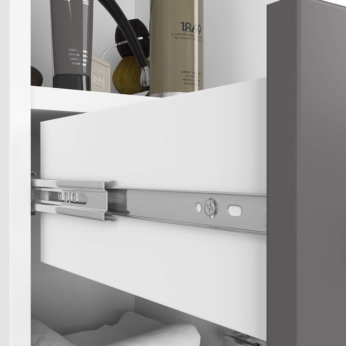 Der Badezimmerschrank besteht aus hochwertigem 16 mm starkem Laminat. Um Ihren Schrank vor Stößen zu schützen, sind die Kanten mit einer ABS-Kante versehen. Der Badezimmerschrank ist in modischem Weiß/Grafitgrau erhältlich. Die Türgriffe des Schranks sind in universellem Silber gehalten. Erwähnenswert ist, dass die Montage dieses Schranks sehr einfach ist und eine Anleitung dem Paket beiliegt.