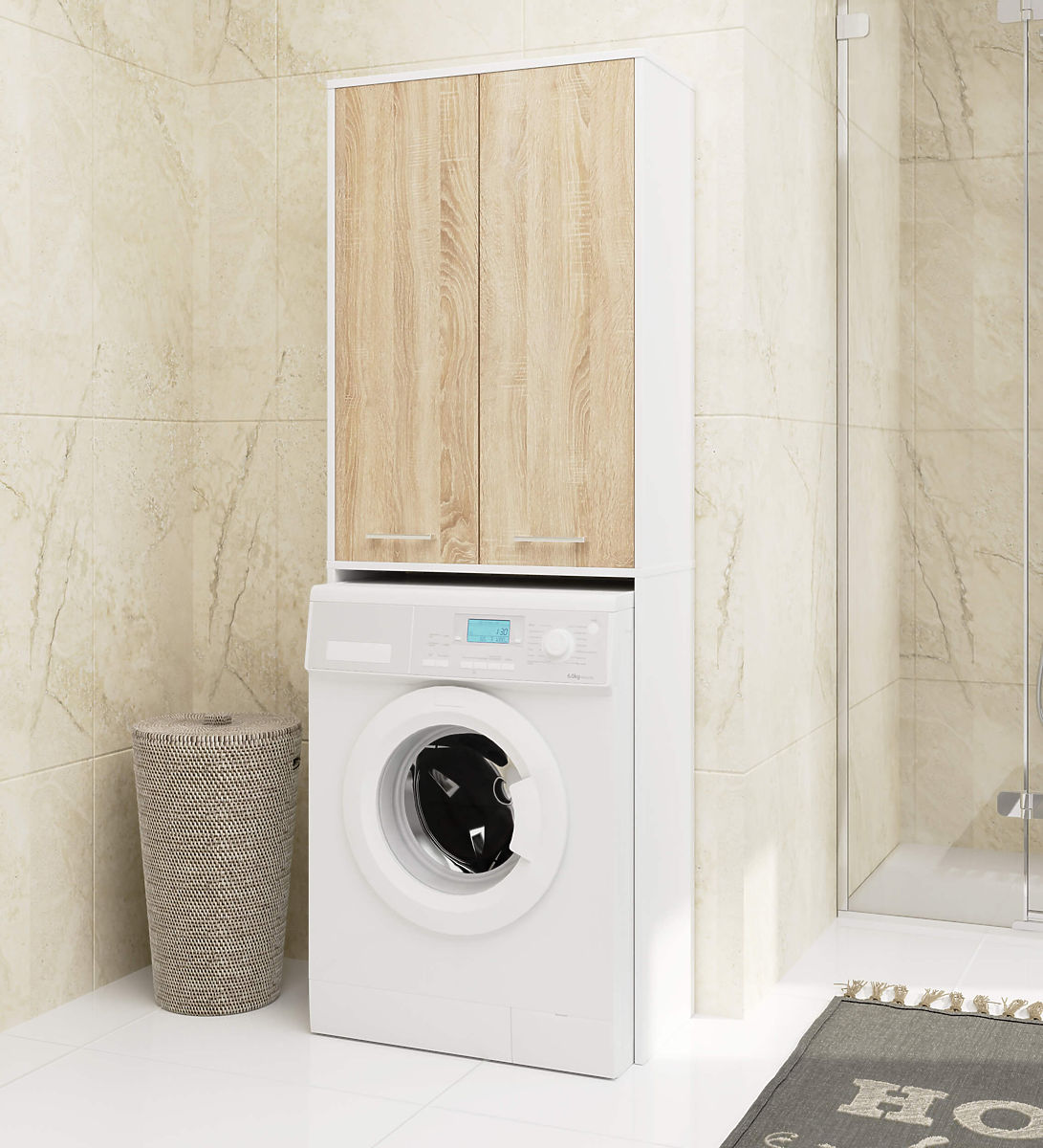 Wenn wir unser Badezimmer bequem und stilvoll einrichten möchten, sollten wir auf solide und funktional gestaltete Möbel achten. Ein solcher Schrank über der Waschmaschine ist sicherlich eine ideale Möglichkeit, den Raum über der Waschmaschine zu nutzen, der normalerweise ungenutzt bleibt. Die optimalen Maße dieser Säule machen sie zu einer großartigen Lösung für kleine Badezimmer. Die ergonomische Form ermöglicht ihre Nutzung in jedem Raum. Dieses Möbelstück, bestehend aus einem Aufsatz über der Waschmaschine und einem Schrank darüber, bietet viel Stauraum für verschiedene Gegenstände. Im Schrank können Produkte wie Waschmittel oder Hygieneartikel aufbewahrt werden. Diese Regale sind zur Aufbewahrung von persönlicher Kosmetik oder Handtüchern gedacht. Der schöne Weißton mit Frontflächen in Sonoma Eiche garantiert uns ein elegantes Aussehen des Badezimmers. Die laminierte Platte, aus der dieser Schrank gefertigt ist, ist ein hochwertiges Material. Sie gewährleistet die Haltbarkeit und Festigkeit der Möbel sowie die Erhaltung ihres ästhetischen Aussehens.