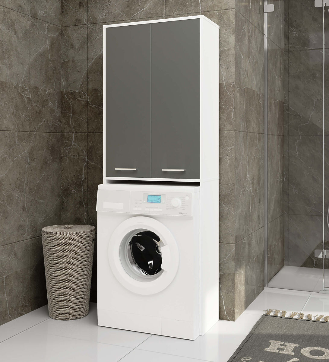 Wenn wir unser Badezimmer bequem und gleichzeitig stilvoll einrichten möchten, sollten wir auf solide und funktional gestaltete Möbel setzen. Ein solcher ist sicherlich der Schrank über der Waschmaschine. Es ist eine ideale Möglichkeit, den Raum über der Waschmaschine zu nutzen, der normalerweise ungenutzt bleibt. Die optimalen Maße dieser Säule machen sie zu einer hervorragenden Lösung für Badezimmer mit kleiner Fläche. Die ergonomische Form ermöglicht ihre Nutzung in jedem Raum. Dieses Möbelstück, bestehend aus einem Aufbau über der Waschmaschine und einem Schrank darüber, bietet viel Stauraum für verschiedene Gegenstände. Im Schrank können wir zum Beispiel Waschmittel oder Hygieneartikel unterbringen. Diese Regale sind für die Aufbewahrung von persönlicher Kosmetik oder Handtüchern vorgesehen. Der schöne Weißton mit graphitgrauen Fronten garantiert uns ein elegantes Erscheinungsbild des Badezimmers. Das laminierte Plattenmaterial, aus dem der Schrank gefertigt ist, ist ein hochwertiges Material. Es gewährleistet die Haltbarkeit und Festigkeit der Möbel sowie die Erhaltung ihres ästhetischen Erscheinungsbildes.