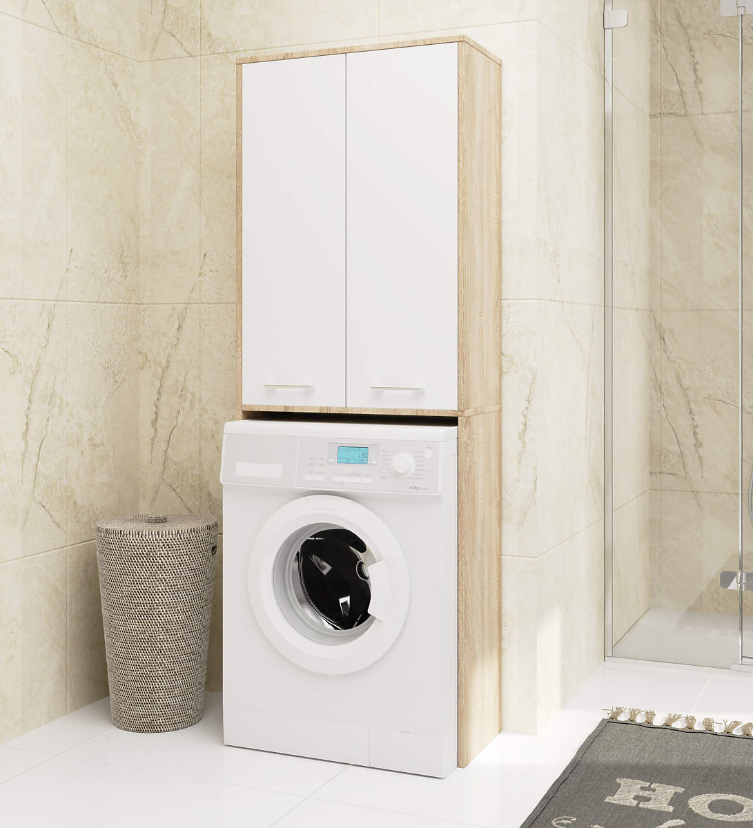 Wenn wir unser Badezimmer bequem und gleichzeitig stilvoll einrichten möchten, sollten wir uns auf solide und funktional hergestellte Möbel konzentrieren. Ein solcher Schrank über der Waschmaschine ist sicherlich eine ideale Lösung, um den Raum über der Waschmaschine zu nutzen, der normalerweise ungenutzt bleibt. Die optimalen Abmessungen dieser Säule machen sie zu einer großartigen Lösung für Badezimmer mit kleiner Fläche. Die ergonomische Form ermöglicht ihre Nutzung in jedem Raum. Dieses Möbelstück, bestehend aus einem Aufsatz über der Waschmaschine und einem Schrank darüber, schafft viel Stauraum für verschiedene Gegenstände. Im Schrank können wir beispielsweise Waschmittel oder Hygieneartikel aufbewahren. Diese Regale sind für die Aufbewahrung von persönlicher Kosmetik oder Handtüchern vorgesehen. Der schöne Farbton, wie Eiche Sonoma mit weißen Fronten, garantiert uns ein elegantes Aussehen des Badezimmers. Das laminierte Plattenmaterial, aus dem dieser Schrank gefertigt ist, ist ein hochwertiges Material. Es gewährleistet die Haltbarkeit und Festigkeit der Möbel sowie die Erhaltung ihres ästhetischen Erscheinungsbildes.