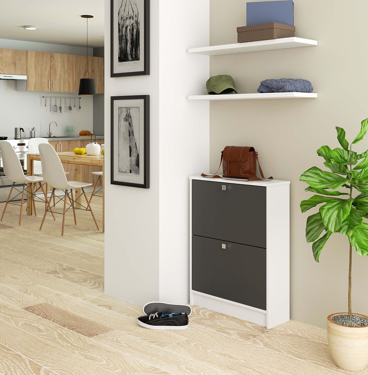 - Im Inneren der Türen befindet sich ein einspuriger Schuhkorb aus Kunststoff