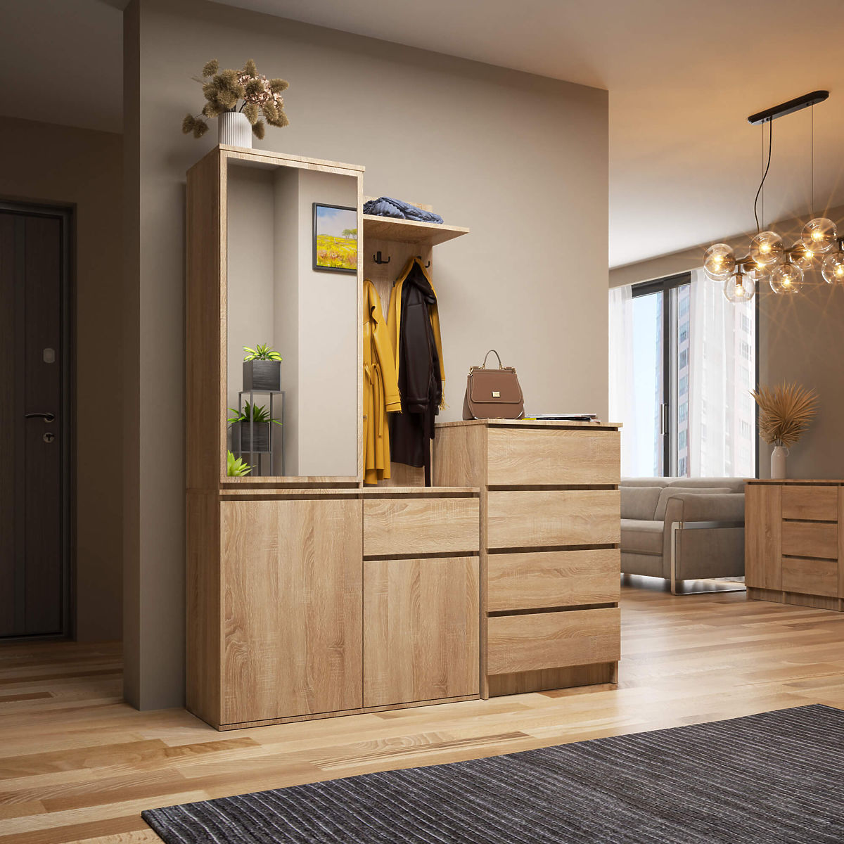 In Räumen mit begrenztem Platz sind Lösungen erforderlich, die die Funktionalität des Innenraums maximieren. Der Flurschrank ENTRO ist eine ausgezeichnete Wahl für einen schmalen Flur oder Eingangsbereich. Er ermöglicht eine clevere Nutzung des kleinen Raums und verleiht dem Raum gleichzeitig einen modernen Stil. Das Produkt bietet eine Vielzahl praktischer Lösungen, darunter ausreichend Platz zum Aufhängen von Jacken oder Mänteln, ein Regal für Schuhe und Accessoires sowie eine Schublade für Kleinigkeiten. Die außergewöhnlich funktionale Anordnung und die große Auswahl an Farbvarianten erfüllen die Erwartungen selbst der anspruchsvollsten Nutzer.