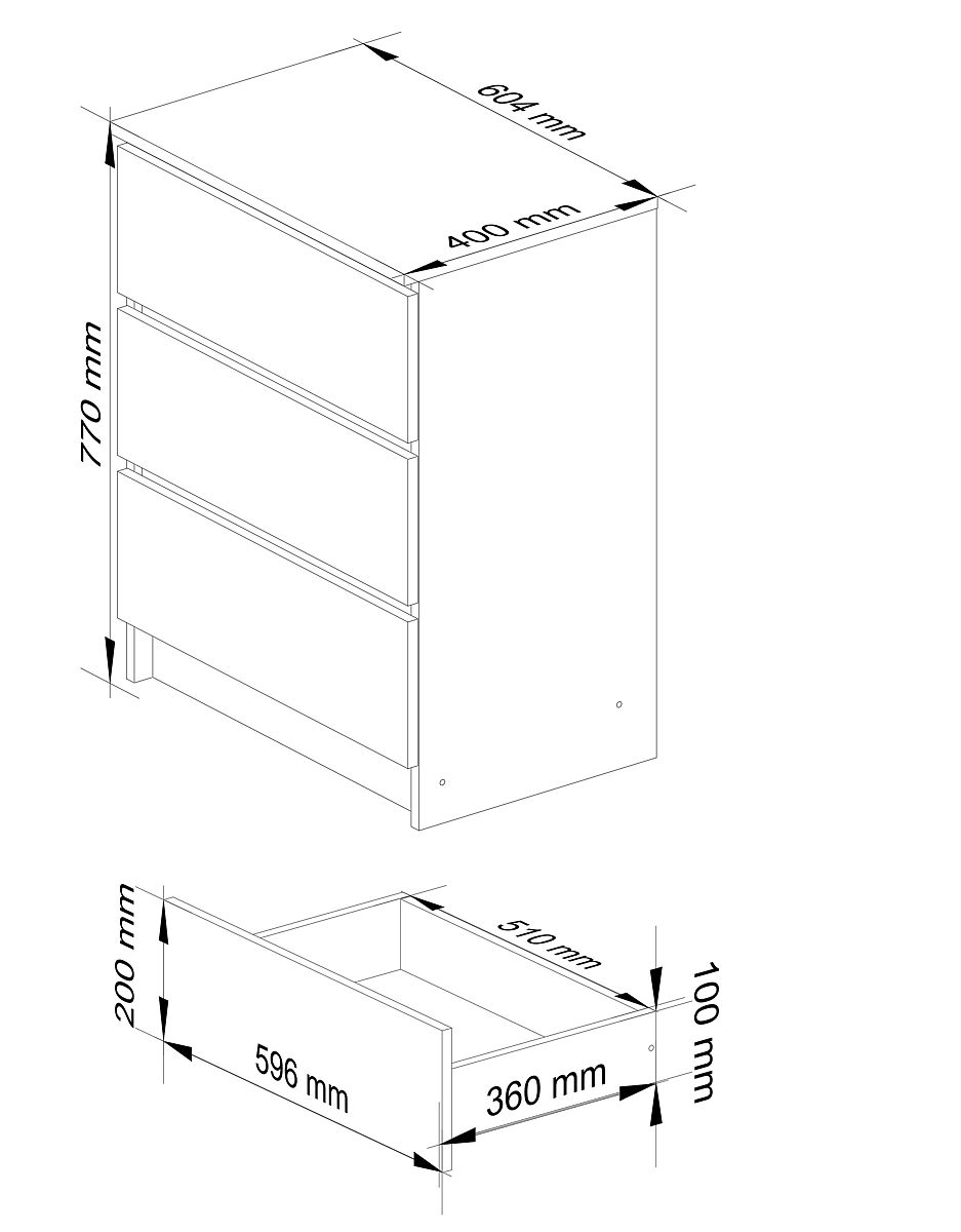 KOMMODE K60 3 SCHUBLADEN Hergestellt aus 16mm abriebfestem laminiertem Plattenmaterial.