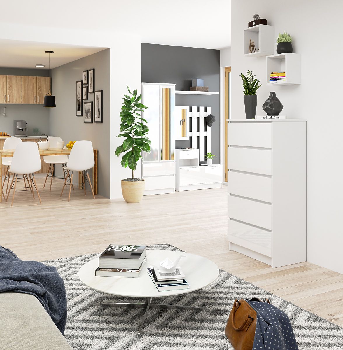 Die geräumige Kommode mit vier Schubladen ist ein Möbelstück, das in vielen Wohn- und Büroräumen Verwendung findet. Sie ermöglicht die Organisation des Stauraums für notwendige Gegenstände im Schlafzimmer, Wohnzimmer, Kinder- oder Jugendzimmer. Sie eignet sich auch hervorragend für das Homeoffice oder den Flur. Sie kombiniert ein einfaches und elegantes Aussehen, zeitlose Farbgebung und eine robuste Konstruktion. Die KOMMODE K 60 cm in Weiß ist mit hochglänzenden Acrylfronten ausgestattet.
