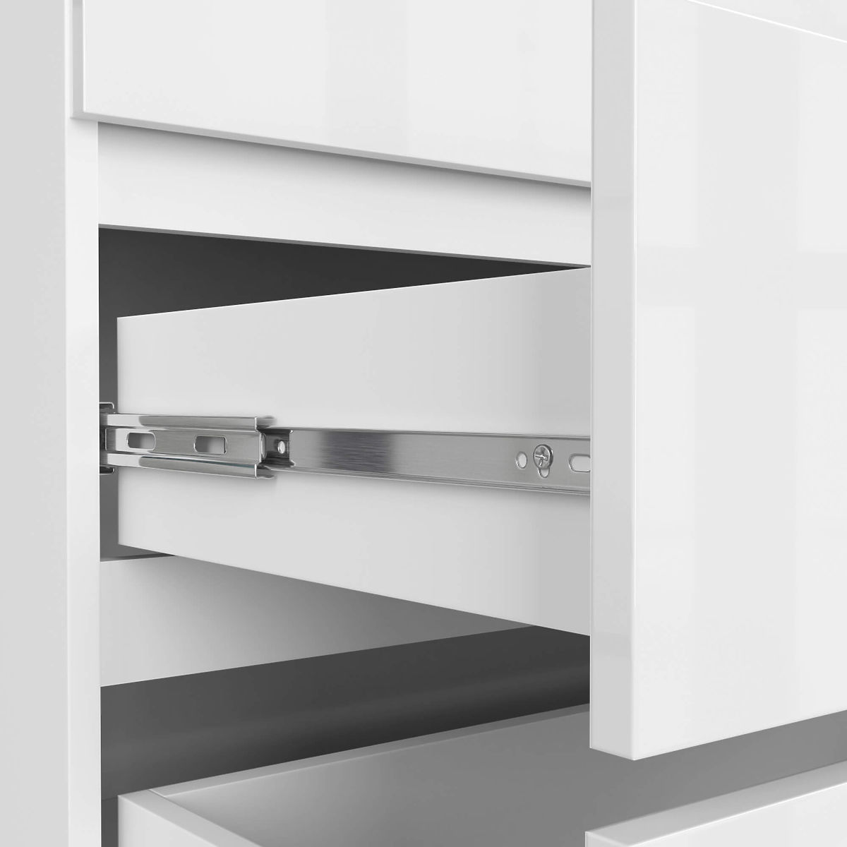 - Schubladen laufen auf Metallkugelführungen
