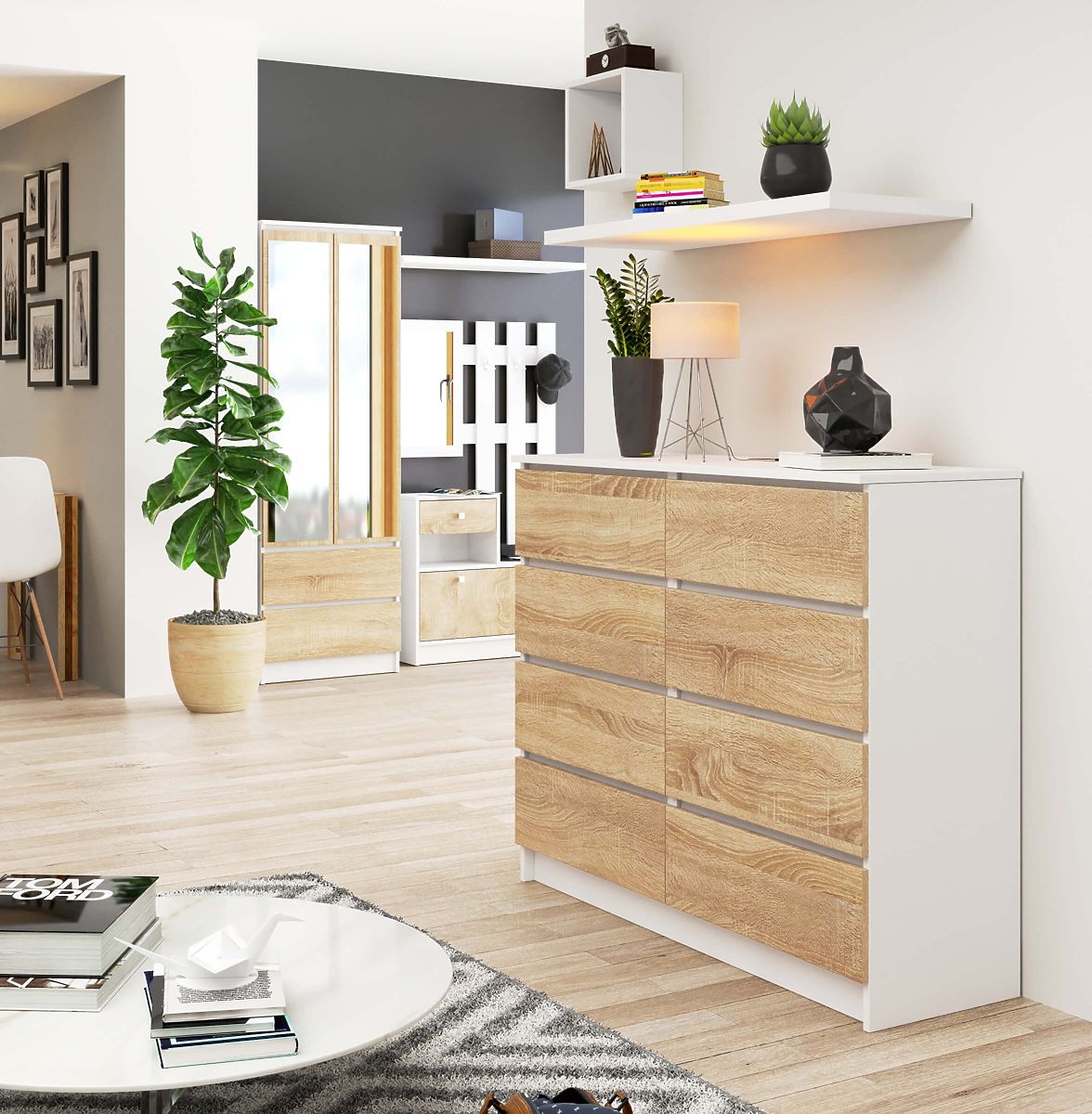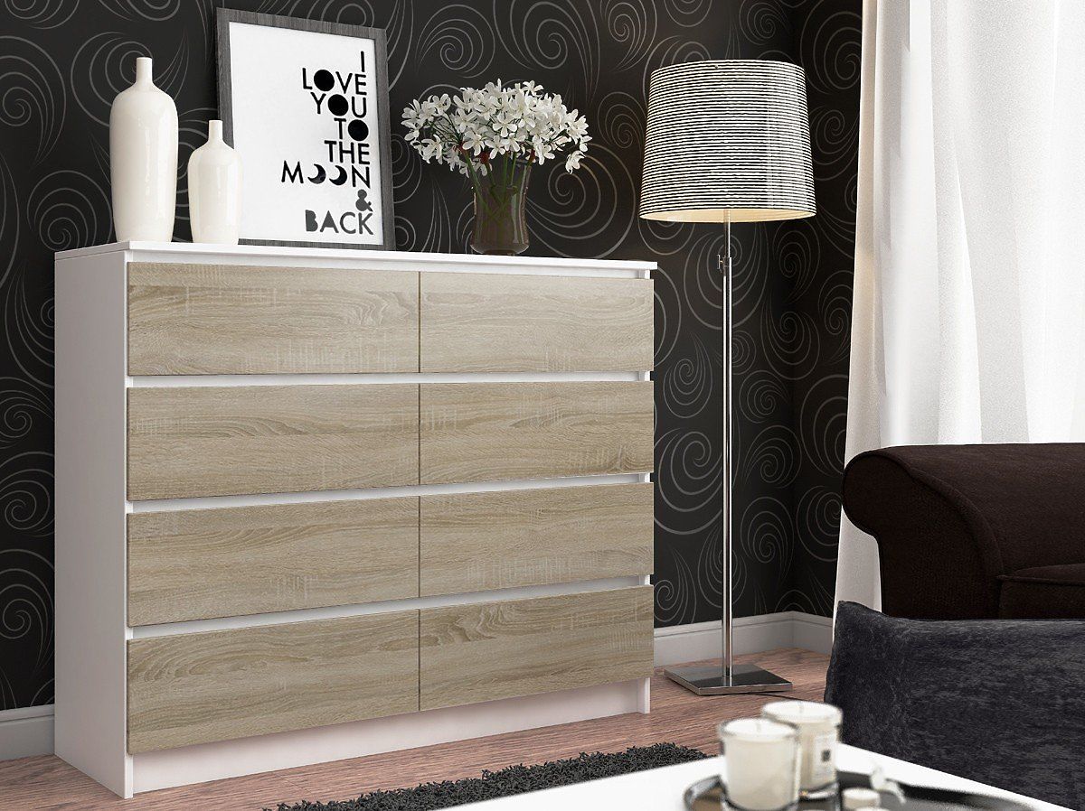 Kommode mit 8 Schubladen aus weißem und Sonoma-Eichenlaminat. .. mehr