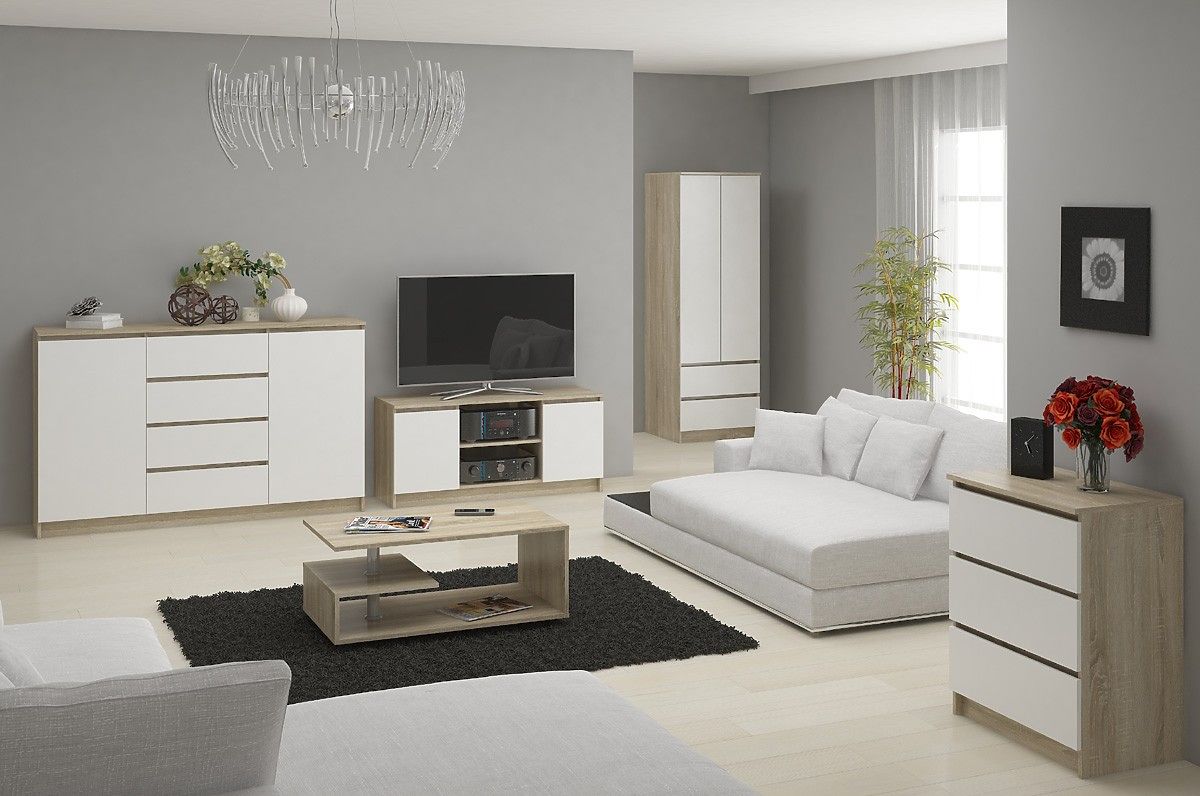Die Kommode ist aus strapazierfähigem, laminiertem Plattenmaterial mit einer Stärke von 16mm gefertigt. Die Kanten sind mit einer ABS-Kante versehen, die Schutz vor Kratzern und allen Beschädigungen bietet. Sie ist in der modernen, skandinavischen Farbe Eiche Sonoma in Kombination mit weißen Fronten der Schubladen erhältlich. Dank des universellen Stils passt sie perfekt in jedes Interieur und jeden Raum. Sie können sie im Schlafzimmer, Kinderzimmer oder sogar im Wohnzimmer platzieren. Eiche Sonoma imitiert die Jahresringe von Naturholz, was den Möbeln zusätzlichen Charme verleiht. Die Kommode hat eine einfache Form und keine Beine.