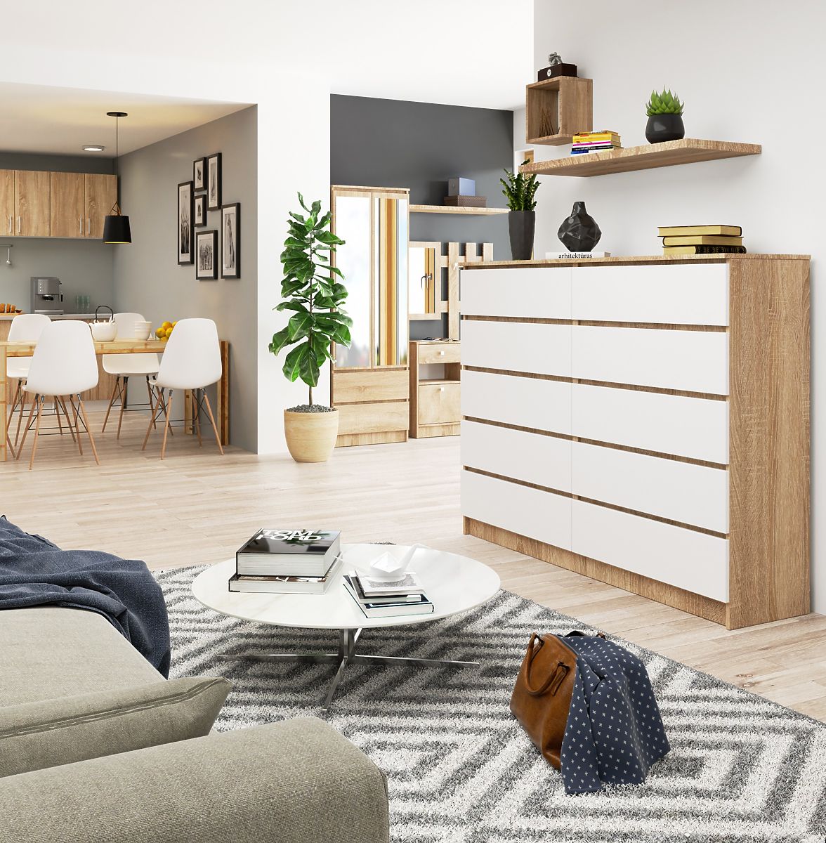 Breite Kommode mit 10 Schubladen in Eiche Sonoma und Weiß. .. mehr