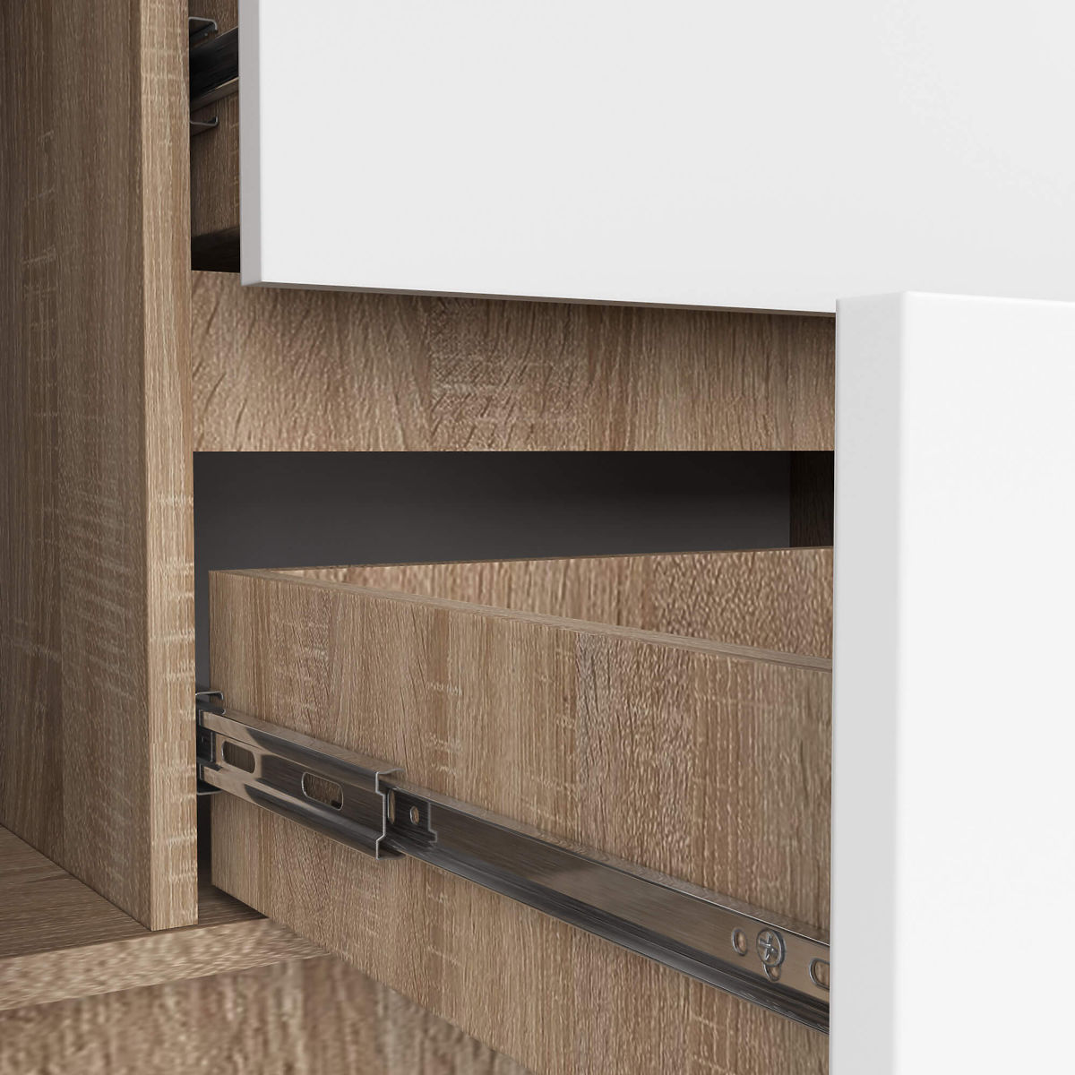 - Schubladen bewegen sich auf Metallkugelführungen - Kanten mit ABS-Kante versehen, die einen hohen Schutz gegen Beschädigungen bietet