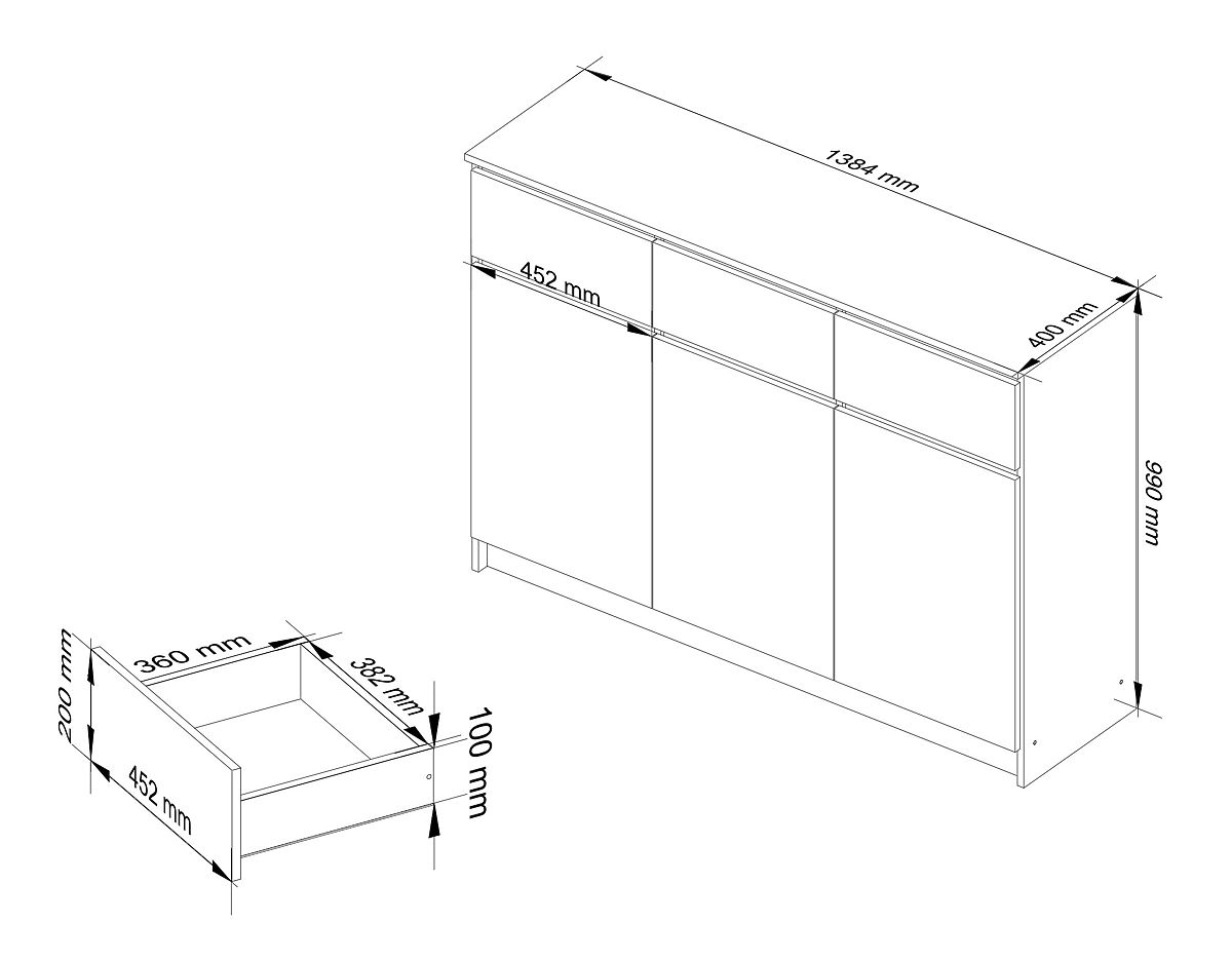 Die Kanten der Kommode sind mit einer ABS-Kante geschützt, die gegen alle Arten von mechanischen Beschädigungen schützt. Die Kommode hat drei Schubladen, die auf Metallkugellaufschienen montiert sind, was eine bequeme Nutzung gewährleistet. Zusätzlich hat sie drei Türen. Hinter jeder Tür befindet sich ein Regal. Die Abmessungen der Kommode sind: 138 cm x 99 cm x 40 cm.
