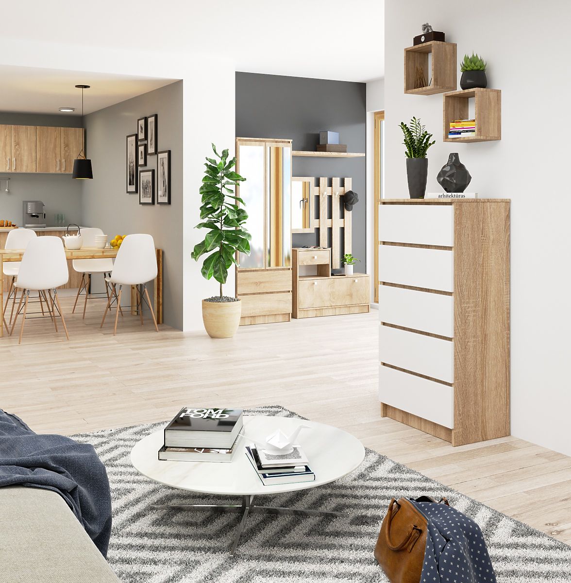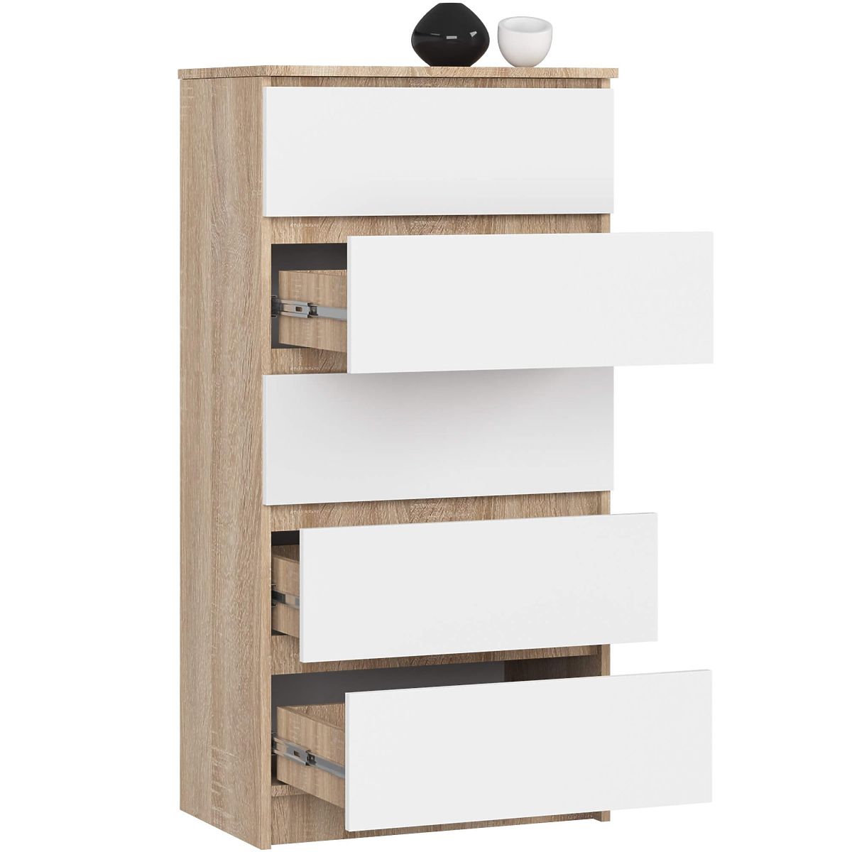 Kommode mit 5 Schubladen aus Eiche Sonoma und weißen Fronten. .. mehr