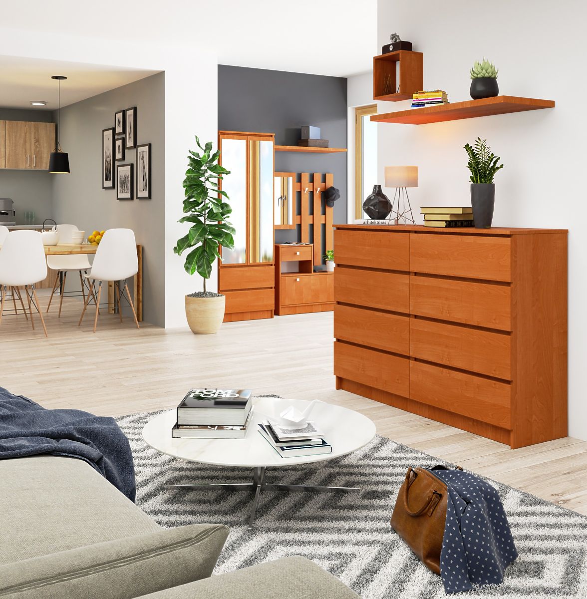 Die Kommode K140 in der Farbe Erle ist für Liebhaber traditionell eingerichteter Innenräume gedacht. Die universelle Farbe und die einfachen Formen der Möbel sorgen dafür, dass sie sich sehr gut für Räume wie Büros, Hotelzimmer, aber auch Wohnräume - Wohnzimmer, Schlafzimmer, Flure oder Esszimmer - eignen. Charakteristische Merkmale dieser Kommode sind vor allem das zeitlose Design, die robuste Konstruktion, die praktische Nutzung und die einfache Pflege. Das Produkt, ausgestattet mit acht geräumigen Schubladen, ermöglicht die Aufbewahrung von Dokumenten, Kleidung und vielen anderen notwendigen Gegenständen im jeweiligen Raum. Der günstige Preis der Möbel ist ein weiterer Vorteil. Wir empfehlen auch, sich mit weiteren Ausstattungsmerkmalen dieser Serie vertraut zu machen.