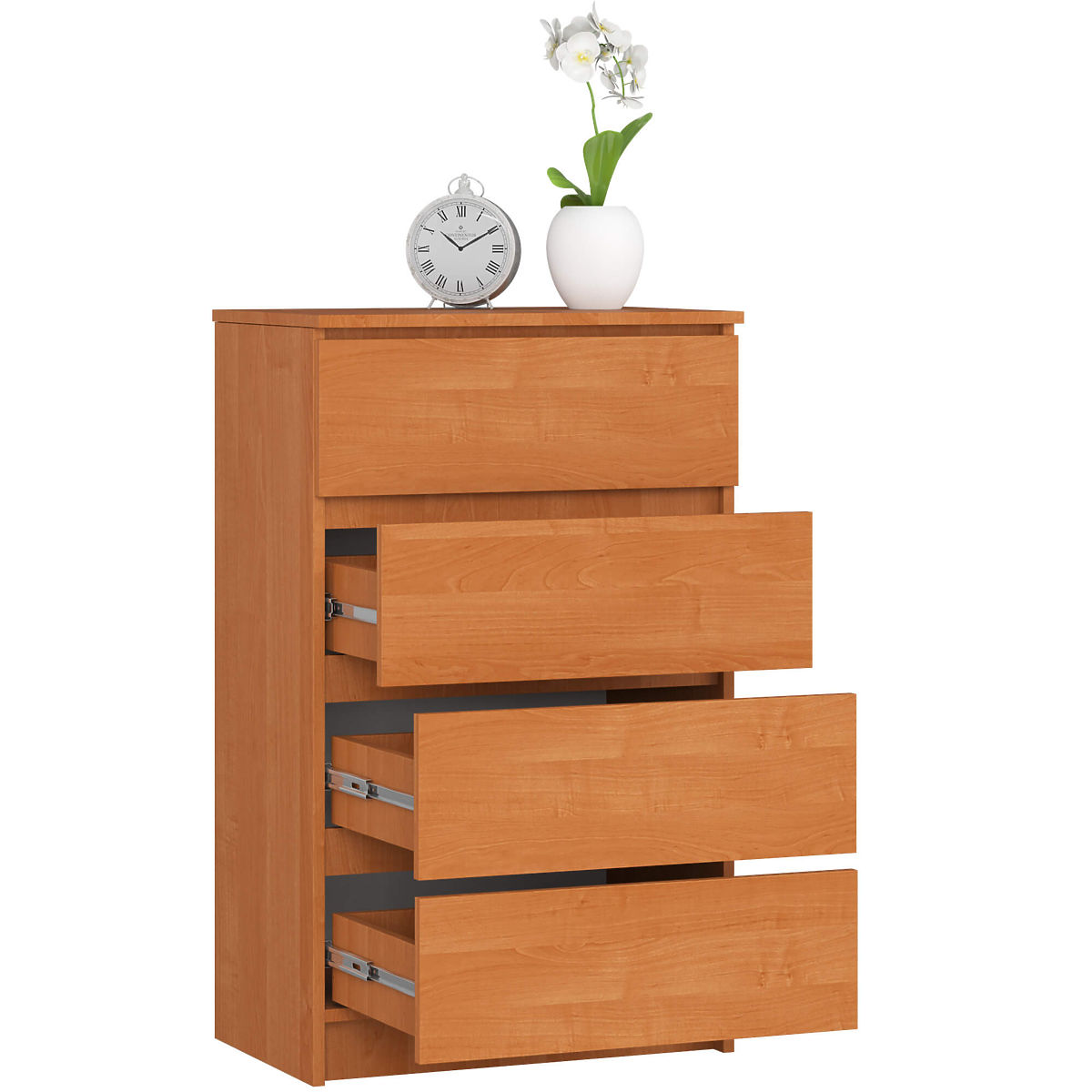 Die einfache, aber gleichzeitig sehr effektvolle Kommode K60 in der zeitlosen Farbe Erle ist ein Vorschlag, der nicht übersehen werden kann. Das robust verarbeitete Möbelstück ist mit vier Schubladen ausgestattet und verfügt über einen widerstandsfähigen Mechanismus, der perfekt an deren Länge und Gewicht angepasst ist. Die Kommode wurde so hergestellt, dass sie den Bedürfnissen und Erwartungen auch der anspruchsvollsten Kunden gerecht wird. Sie findet Anwendung in vielen Wohnräumen sowie in Bürobereichen, wo sie die Aufbewahrung notwendiger Gegenstände ermöglicht. Erwähnenswert ist das günstige Preis-Leistungs-Verhältnis. Die Kommoden in unserem Online-Shop erfreuen sich großer Beliebtheit bei Kunden, für die Funktionalität Priorität hat. Zu den präsentierten Möbeln können leicht weitere Elemente ausgewählt werden, die optisch harmonieren und so ein stimmiges Gesamtbild schaffen.