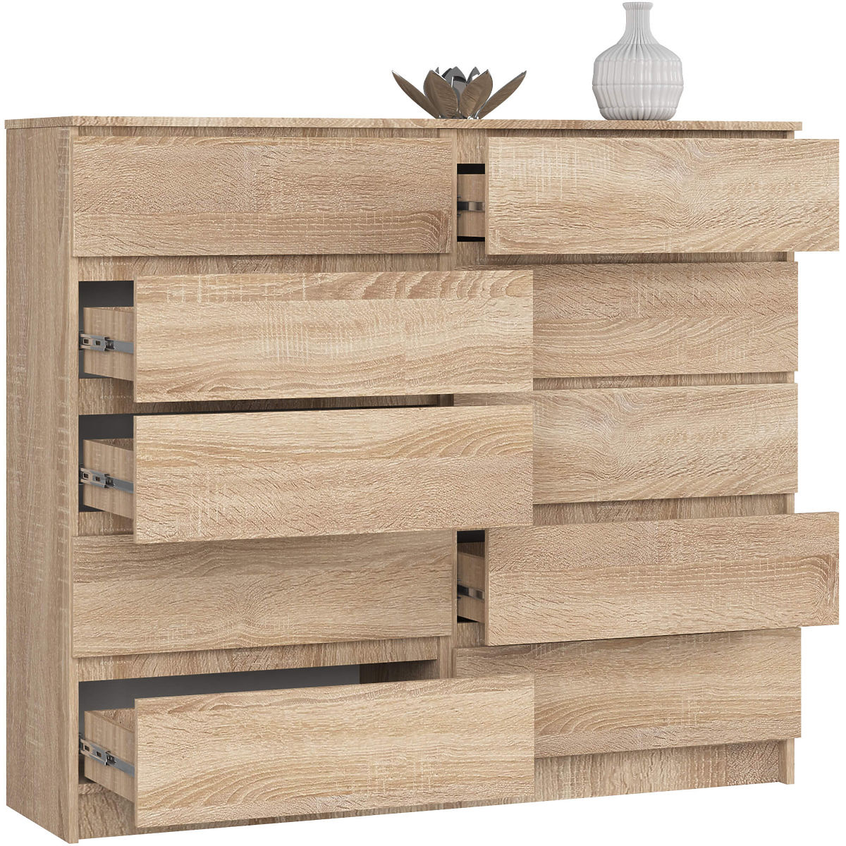 Solide Möbel aus unserem Angebot sind beliebt bei Kunden, die klassischen Minimalismus bevorzugen. Die vorgestellte Kommode K140 besticht durch ihre einfache Form, universelle Farbgebung (Eiche Sonoma) und praktische Lösungen. Wir legen besonderen Wert auf Qualität und bieten Möbel aus strapazierfähigen und hochwertigen Materialien an. Unser empfohlenes Modell mit zehn Schubladen eignet sich hervorragend für das Wohnzimmer, Schlafzimmer oder Büro, aber auch für viele andere Räume, die Sie modisch und funktional einrichten möchten. Gute Qualität zu einem niedrigen Preis wird sicherlich Anhänger moderner Lösungen erfreuen. Wir empfehlen auch, sich mit weiteren Möbelstücken aus dieser Kollektion vertraut zu machen - alle Kommoden zeichnen sich durch solide Verarbeitung und strapazierfähige Materialien aus, aus denen sie gefertigt sind.