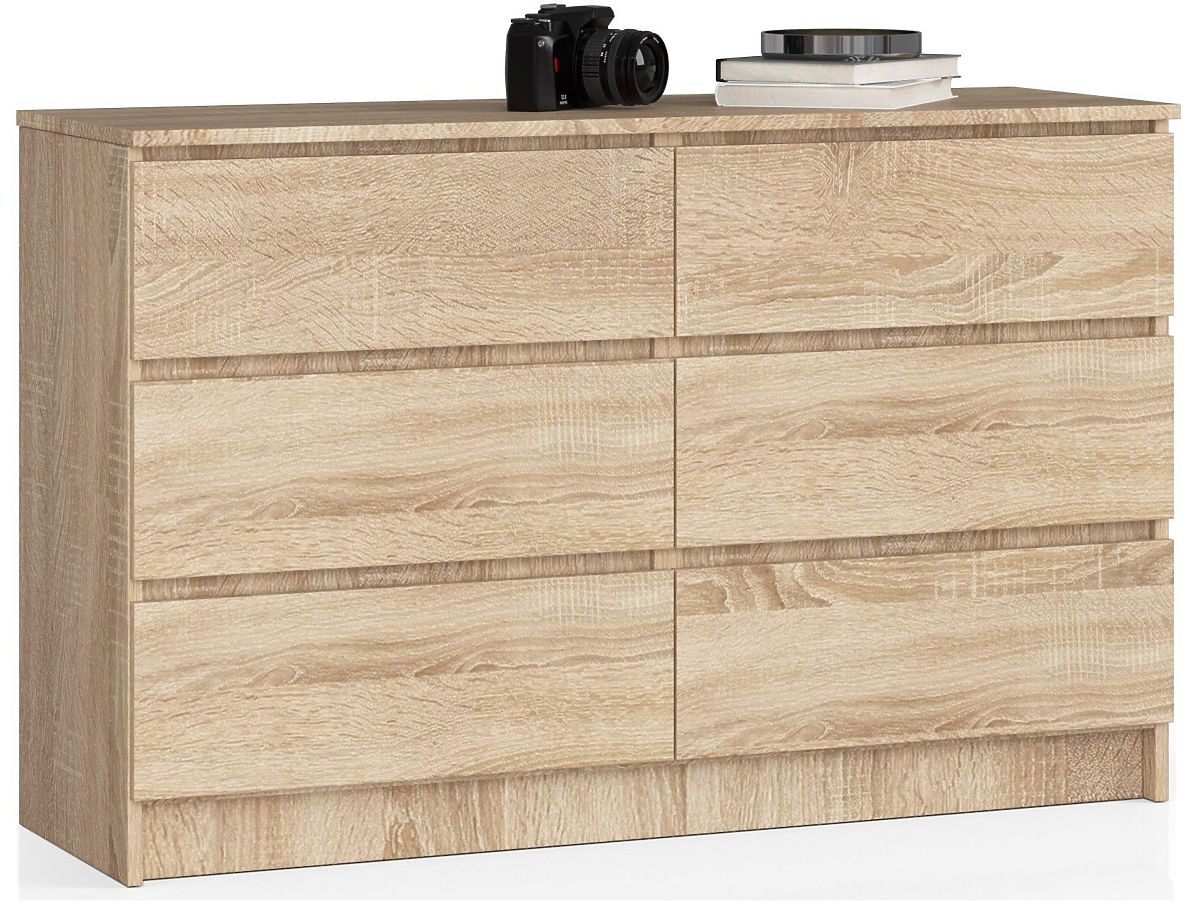 Sechs praktische Schubladen, eine lange Platte und eine Farbe, die bei Menschen, die leicht zu reinigende, universelle und zeitlose Möbel bevorzugen, sehr beliebt ist - das sind die Eigenschaften, die die Kommode K140 in der Farbe Eiche Sonoma charakterisieren. Dieses Angebot verdient Aufmerksamkeit vor allem wegen seines Designs und seiner außergewöhnlichen Funktionalität, aber es lohnt sich auch, auf die hohe Qualität und die sorgfältige Verarbeitung der Möbel zu achten, die sowohl in Büroräumen als auch im Wohnzimmer, Esszimmer, Schlafzimmer oder vielen anderen Wohnräumen erfolgreich eingesetzt werden können. Die solide Verarbeitung aus langlebigen Materialien wird sicherlich auch die anspruchsvollsten Kunden schätzen, für die der günstige Preis der Möbel ebenfalls ein Vorteil sein wird.