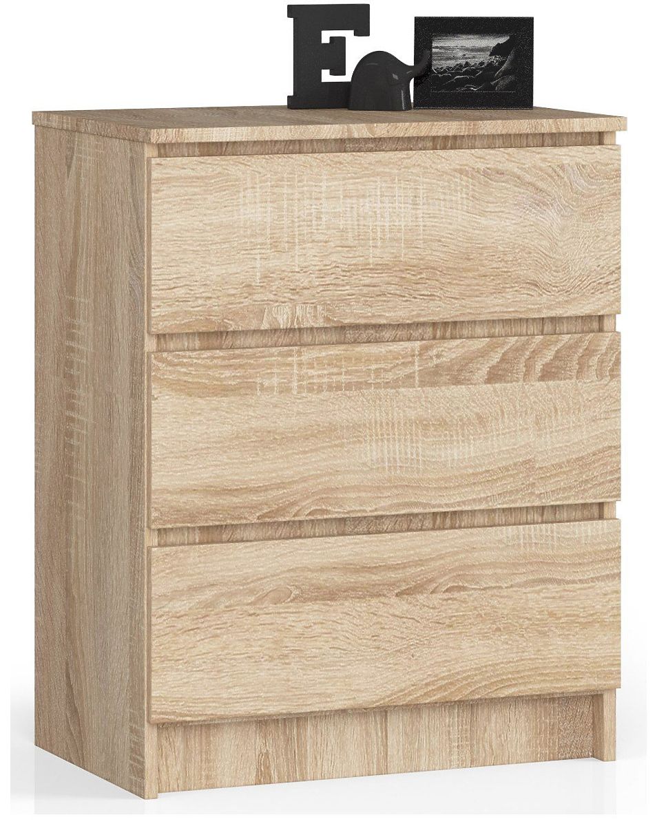 Kleine, aber geräumige Kommode mit drei Schubladen, deren Oberflächenbehandlung die Erwartungen anspruchsvoller Kunden erfüllt. Verwendet wurde Eiche Sonoma, eine Farbe, die perfekt zu hellen Innenräumen passt. Das Produkt eignet sich für das Schlafzimmer, Wohnzimmer, Zimmer oder den Flur - alles hängt von den Bedürfnissen unserer Kunden ab. Wir bieten ein Stück aus 16 Millimeter dickem Laminat an. Es ist ein abriebfestes Material, das zusätzlich mit einer ABS-Kante verstärkt ist. Das Modell verwendet Schubladen, die auf Metallkugellagern gleiten, was einen reibungslosen, sanften und präzisen Lauf gewährleistet.