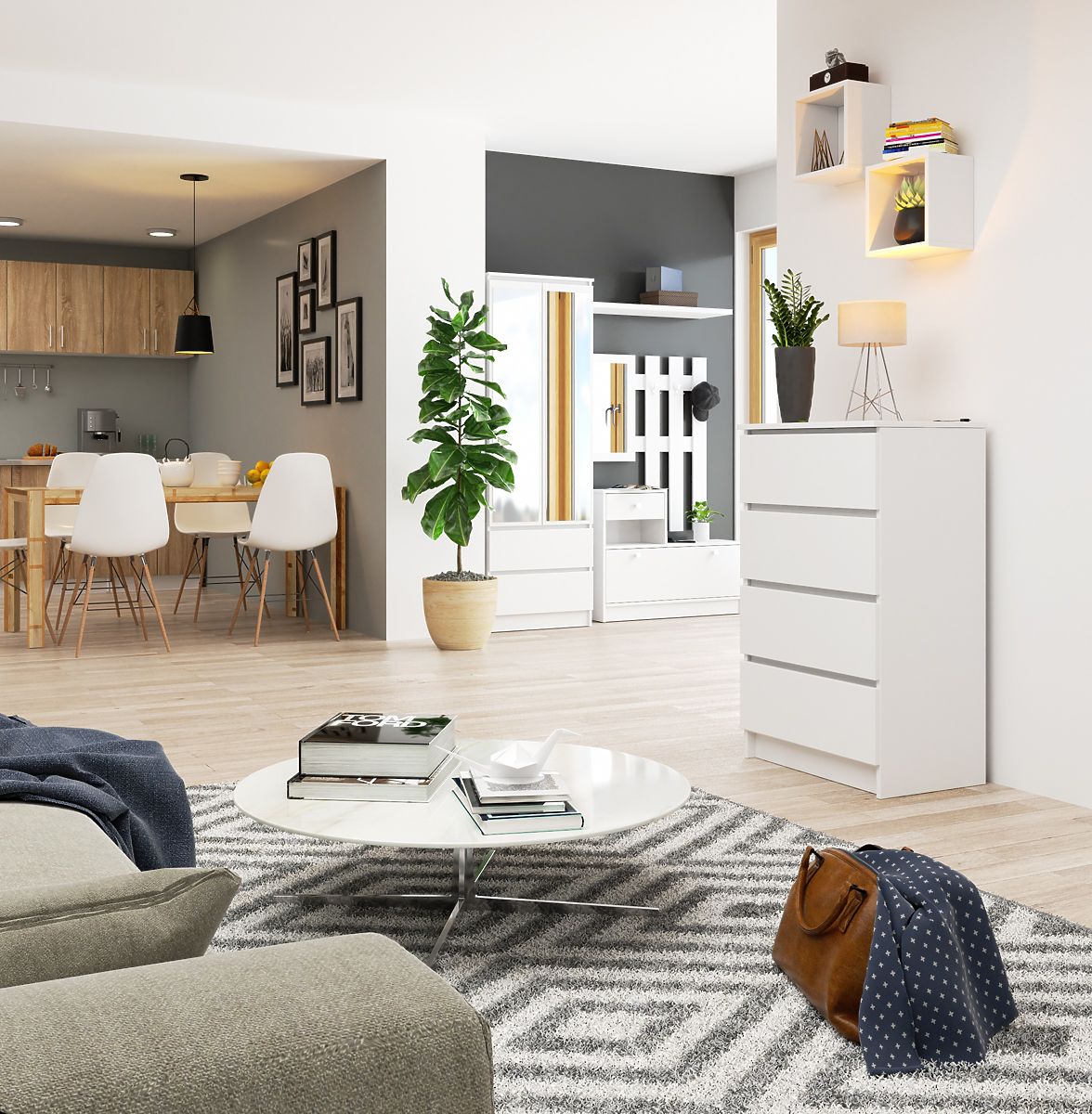Die hohe Kommode in Weiß ist eine interessante Wahl, die sowohl im Wohnbereich als auch in Büroräumen genutzt werden kann. Das funktionale Möbelstück besteht aus vier Schubladen, die aus einer 16 Millimeter dicken laminierten Platte gefertigt sind. Das Material zeigt eine hohe Abriebfestigkeit, was die Langlebigkeit und Stabilität der Kommode beeinflusst. Ihr modernes Design verdient Aufmerksamkeit - Einfachheit und Eleganz sowie der minimalistische Stil, in dem sie gehalten ist. Eine günstige, aber sehr effektvolle Wahl, die sicherlich ihre Funktion perfekt erfüllt und die Aufbewahrung vieler notwendiger Gegenstände im Flur, Esszimmer, Wohnzimmer, Jugendzimmer oder Schlafzimmer ermöglicht. Das Produkt zur Selbstmontage zeichnet sich durch eine äußerst sorgfältige und solide Verarbeitung aus.