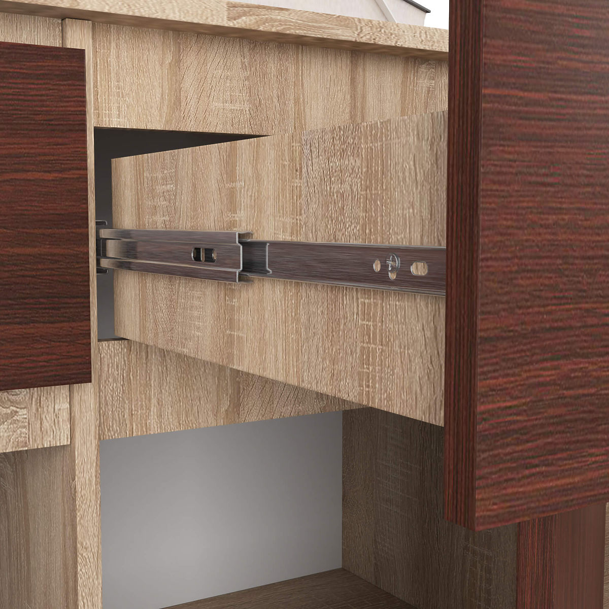 - Schubladen bewegen sich auf Metallkugelführungen