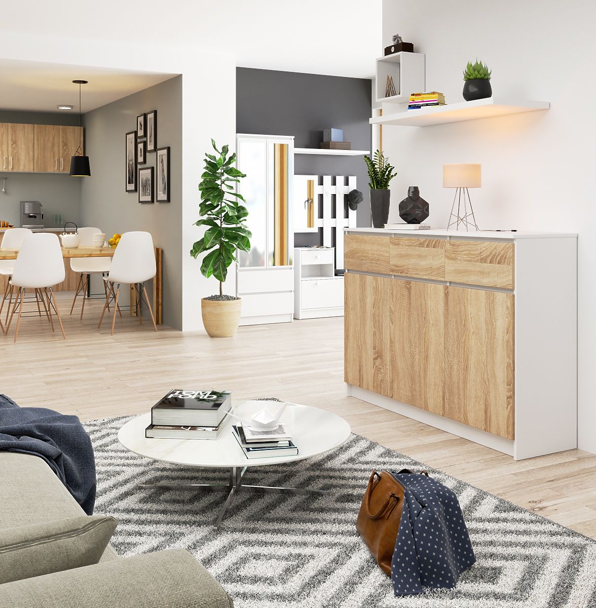 Kommode mit 3 Türen und 3 Schubladen in Weiß und Sonoma Eiche. .. mehr