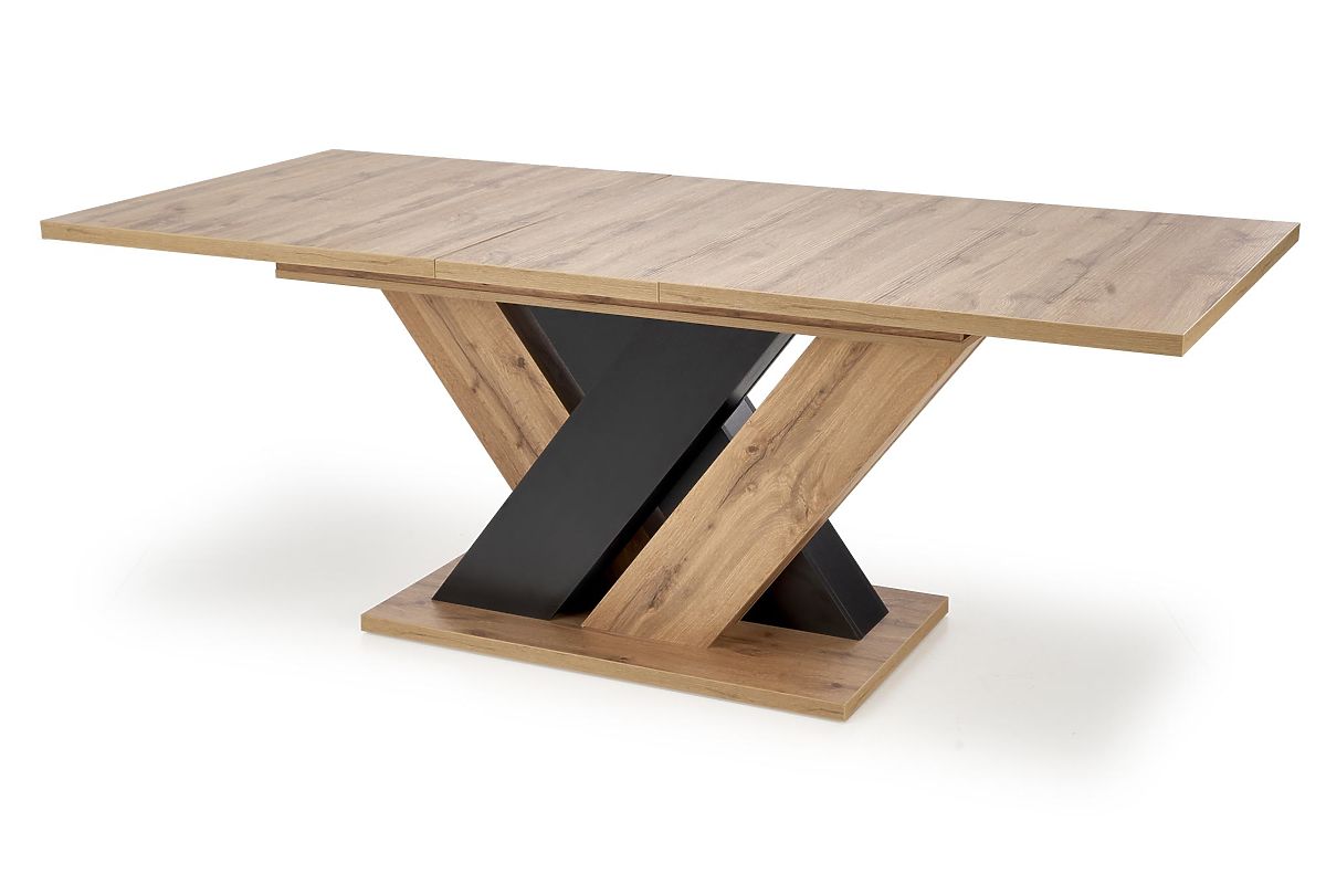 Die interessante Gestaltung der Beine, die aus einer Platte in Kombination der Dekore Eiche Wotan und Schwarz gefertigt sind, verleiht dem Tisch ein einzigartiges Aussehen und schafft ein markantes Element im Interieur. Die Konstruktion in X-Form sorgt gleichzeitig für hervorragende Stabilität und Festigkeit, sodass Sie sich keine Sorgen über unerwünschtes Wackeln oder Verrutschen machen müssen.