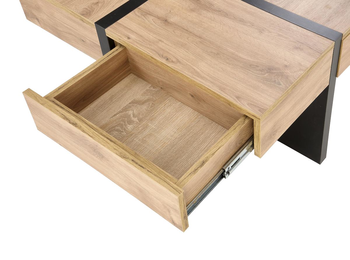 Der stilvolle Couchtisch SEVILLA ist ein modernes und funktionales Accessoire, das sich hervorragend in jedes Wohnzimmer einfügt. Seine einzigartige Konstruktion mit vier versteckten Schubladen bietet überraschend viel Stauraum, ohne das klare und elegante Erscheinungsbild des Tisches zu stören. Dank des cleveren Öffnungssystems durch Verschieben von Teilen der oberen Platte wirkt der Tisch dynamisch und gleichzeitig sehr minimalistisch. Der Couchtisch SEVILLA ist mit einem Fokus auf Praktikabilität und Ästhetik entworfen. Die Kombination aus Eiche Craft Dekor und kontrastierenden schwarzen Beinen schafft ein zeitloses Erscheinungsbild, das sich leicht in moderne und industrielle Interieurs einfügt. Die robuste Konstruktion und hochwertigen Materialien gewährleisten eine lange Lebensdauer und Komfort im täglichen Gebrauch.