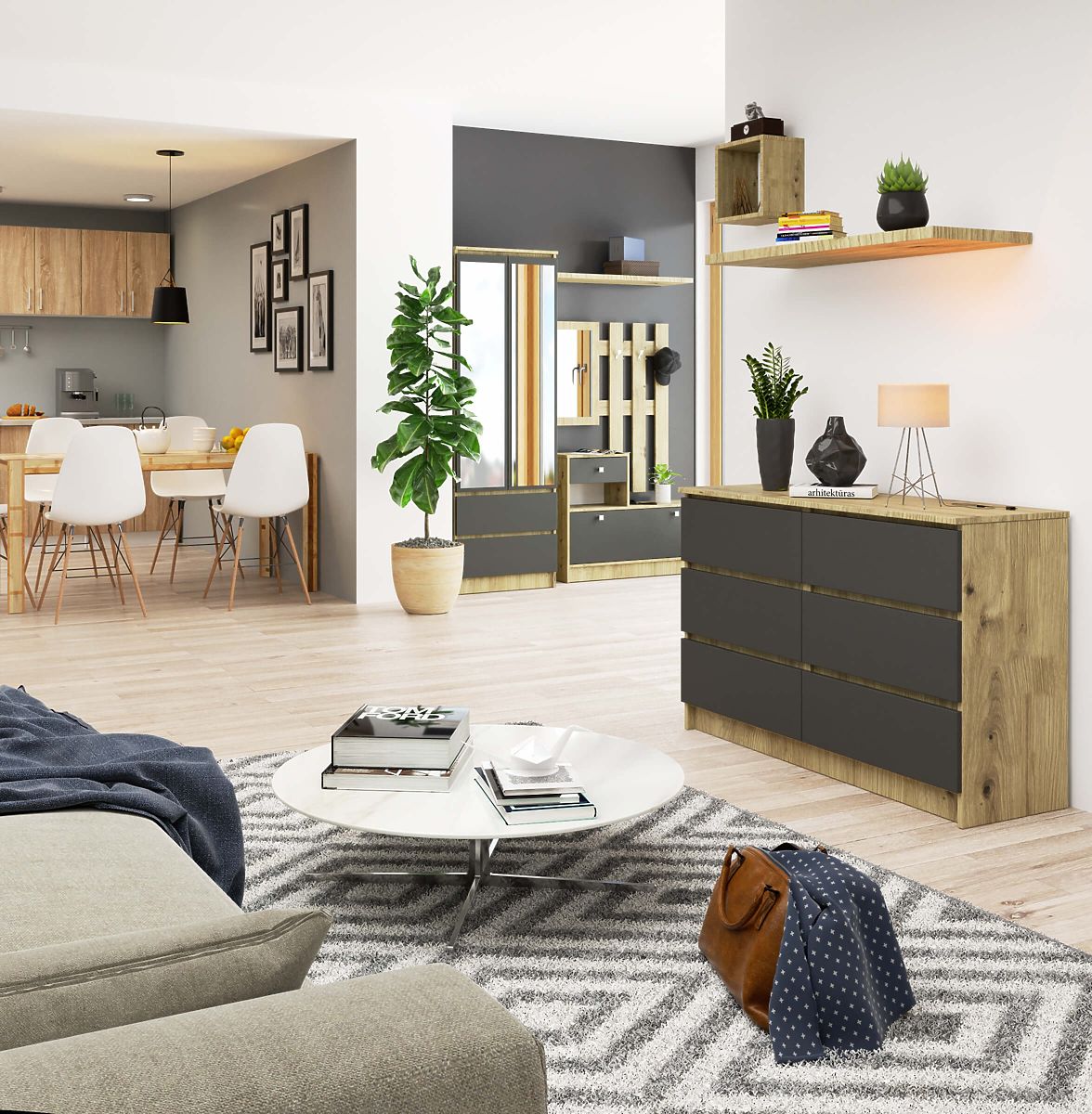 Kommode mit 6 Schubladen aus Eiche Artisan und Grafit Grau. .. mehr