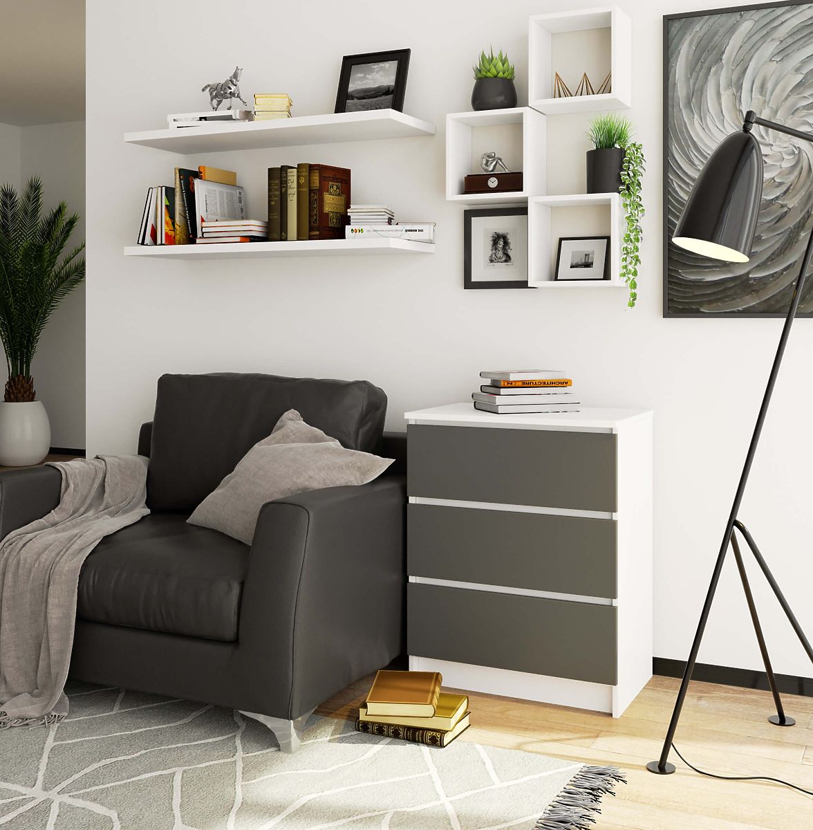 Kommode mit 3 Schubladen, weißem Korpus und graphitgrauen Fronten. .. mehr