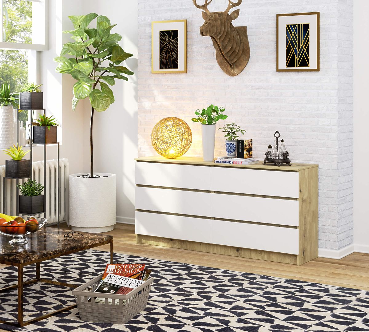 Die Kommode für das Wohnzimmer K 160 cm ist ein Möbelstück mit sechs geräumigen Schubladen. Die Kombination aus Eiche Artisan und zeitlosem Weiß führte zur Schaffung eines Möbelstücks, das perfekt in viele verschiedene Innenräume passt. Sie findet Verwendung im Schlafzimmer, Wohnzimmer, Jugendzimmer und Büro. Die Kommode harmoniert mit Räumen, die im minimalistischen, modernen, skandinavischen, Retro- und Loft-Stil eingerichtet sind. Es ist eine perfekte Kombination aus Einfachheit und Eleganz, die auch die anspruchsvollsten Kunden schätzen werden.