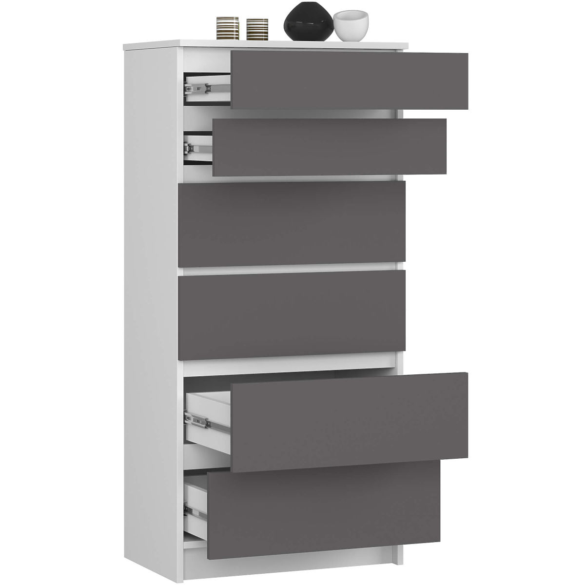 Kommode mit 6 Schubladen in Weiß und Graphitgrau. .. mehr
