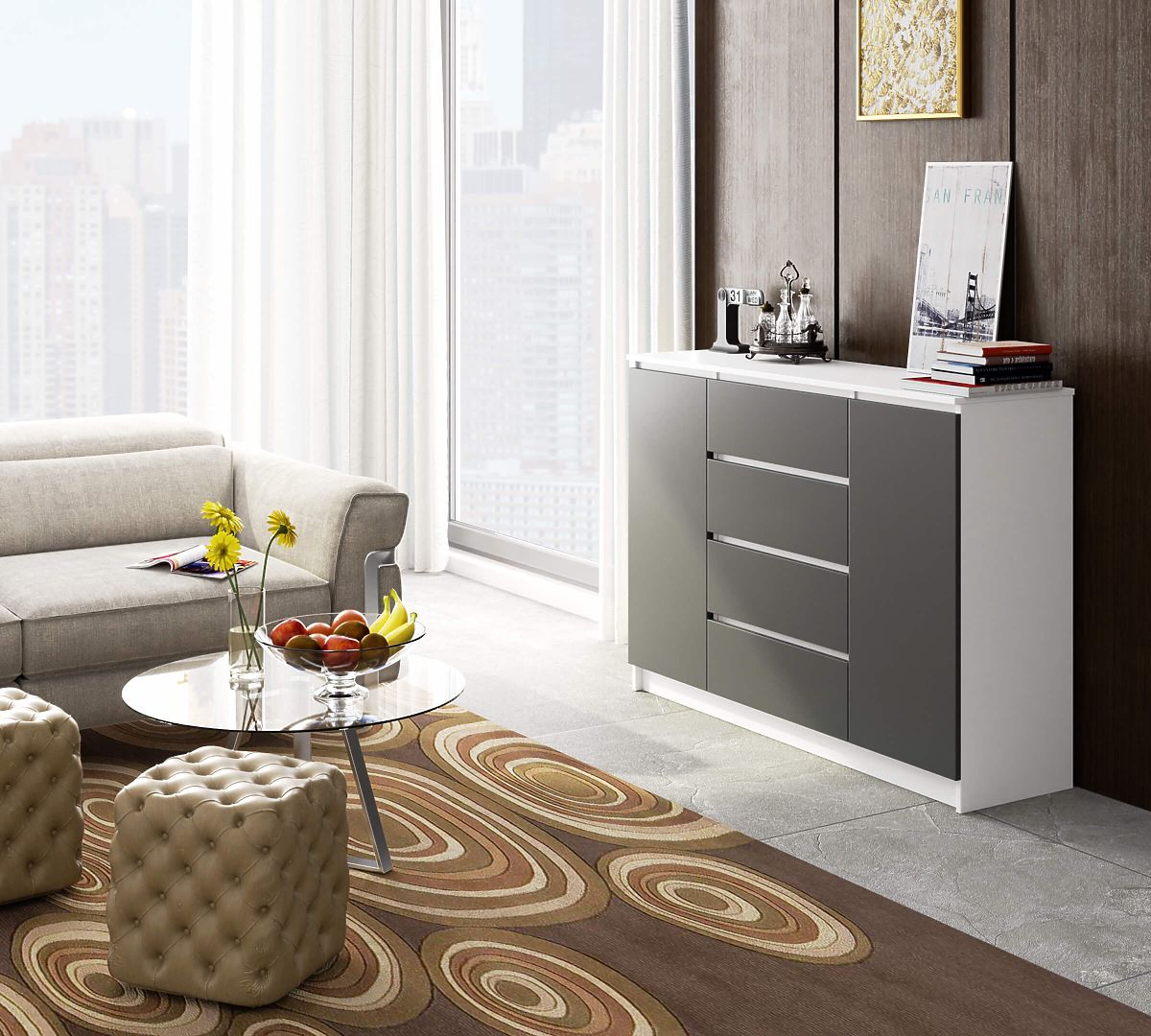 Kommode mit 2 Türen und 4 Schubladen in Weiß und Graphitgrau. .. mehr