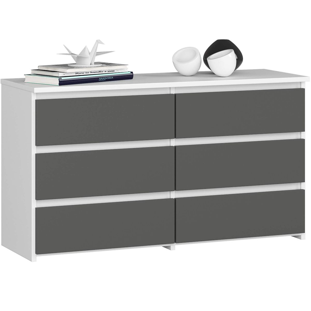 In der Möbelbranche wird besonderer Wert auf die Funktionalität der Produkte und ihre hohe ästhetische Qualität gelegt. Ein hervorragendes Beispiel ist die Kommode CL 100 cm. Dieses praktische Möbelstück ist aus abriebfestem laminiertem Plattenmaterial gefertigt, was seine Langlebigkeit und Widerstandsfähigkeit garantiert. In den sechs geräumigen Schubladen finden verschiedene Bücher, Dokumente oder Kleinigkeiten Platz. Einige unserer Kunden entscheiden sich dafür, Kleidung oder Unterwäsche darin zu verstauen. Die weiße Kommode mit graphitgrauen Fronten hat ein elegantes Design. Die schlichte Form und die elegante Ausführung passen sowohl in klassische und elegante als auch in romantische Innenräume. Dieses außergewöhnliche Möbelstück präsentiert sich perfekt in einem eleganten Wohnzimmer oder einem gemütlichen Schlafzimmer. Es wird auch oft als Teil eines Kleiderschranks oder Flurs verwendet. Die Kommode mit 6 Schubladen wird sowohl von Einzelkunden als auch von Unternehmern geschätzt. Dank ihres makellosen Aussehens und ihrer unglaublichen Kapazität eignet sie sich hervorragend als Teil der Büroausstattung.