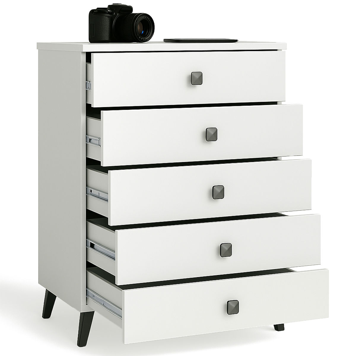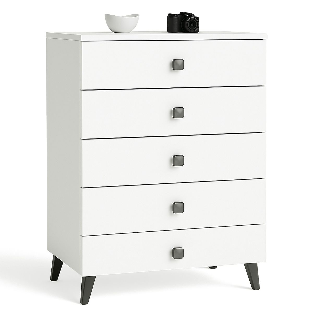Die kleine Kommode ist ein Einrichtungselement, das in jedem Raum Verwendung findet. Moderne Farben, robuste Konstruktion und sorgfältige Verarbeitung führten zur Schaffung eines Schranks, der sich beispielsweise im Flur, Wohnzimmer oder Jugendzimmer sowie im Schlafzimmer bewährt. Sie kann auch im Bürobereich verwendet werden, wo sie die Aufbewahrung vieler Dokumente und anderer Bürobedarf ermöglicht. Die Kommode besteht aus 5 Schubladen. Das Möbelstück kombiniert die Farben Weiß und Schwarz.