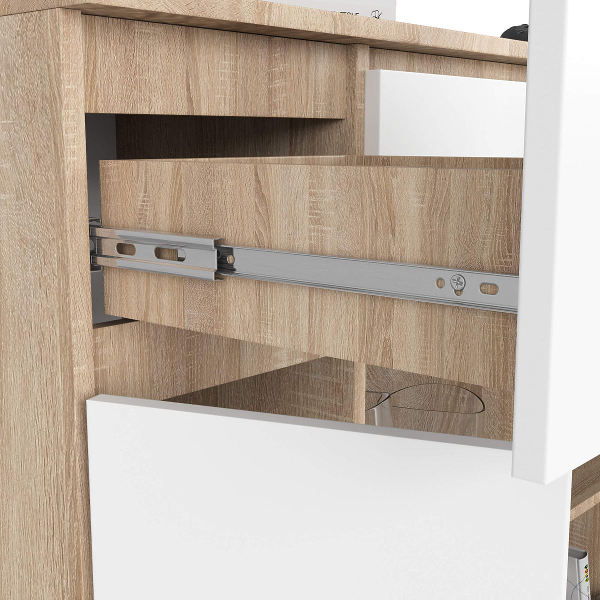 - Schubladen laufen auf Metallkugelführungen