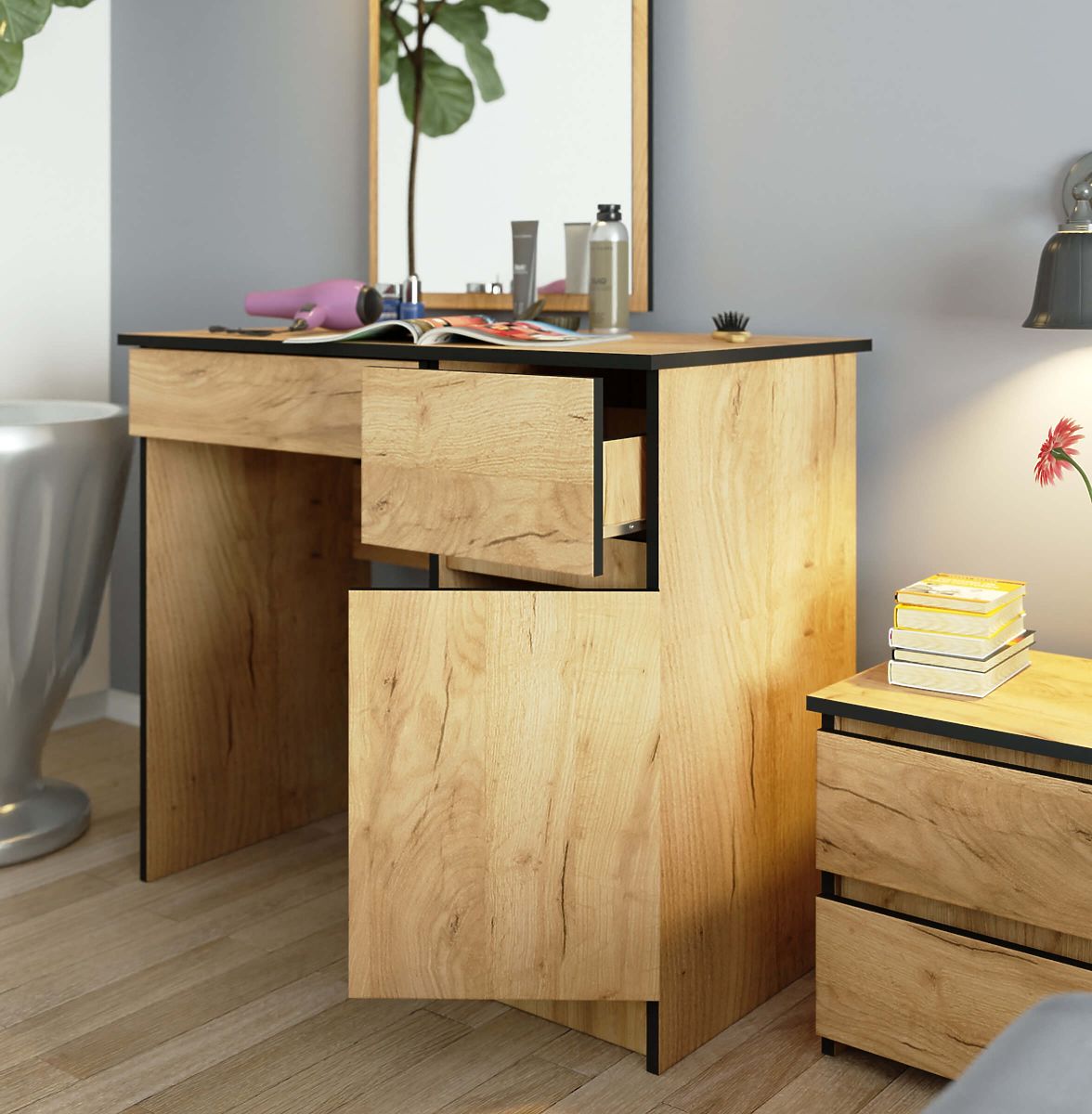 Schminktisch mit Spiegel und Stauraum in Eiche Craft. .. mehr