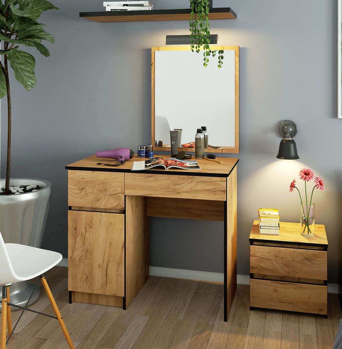 Kompakte Version des Schminktisches für Frauen, die morgens schnell Make-up auftragen möchten. Eine Lösung, die nicht nur für das Schlafzimmer geeignet ist. Die Maße des Schminktisches eignen sich auch hervorragend für Kosmetiksalons.