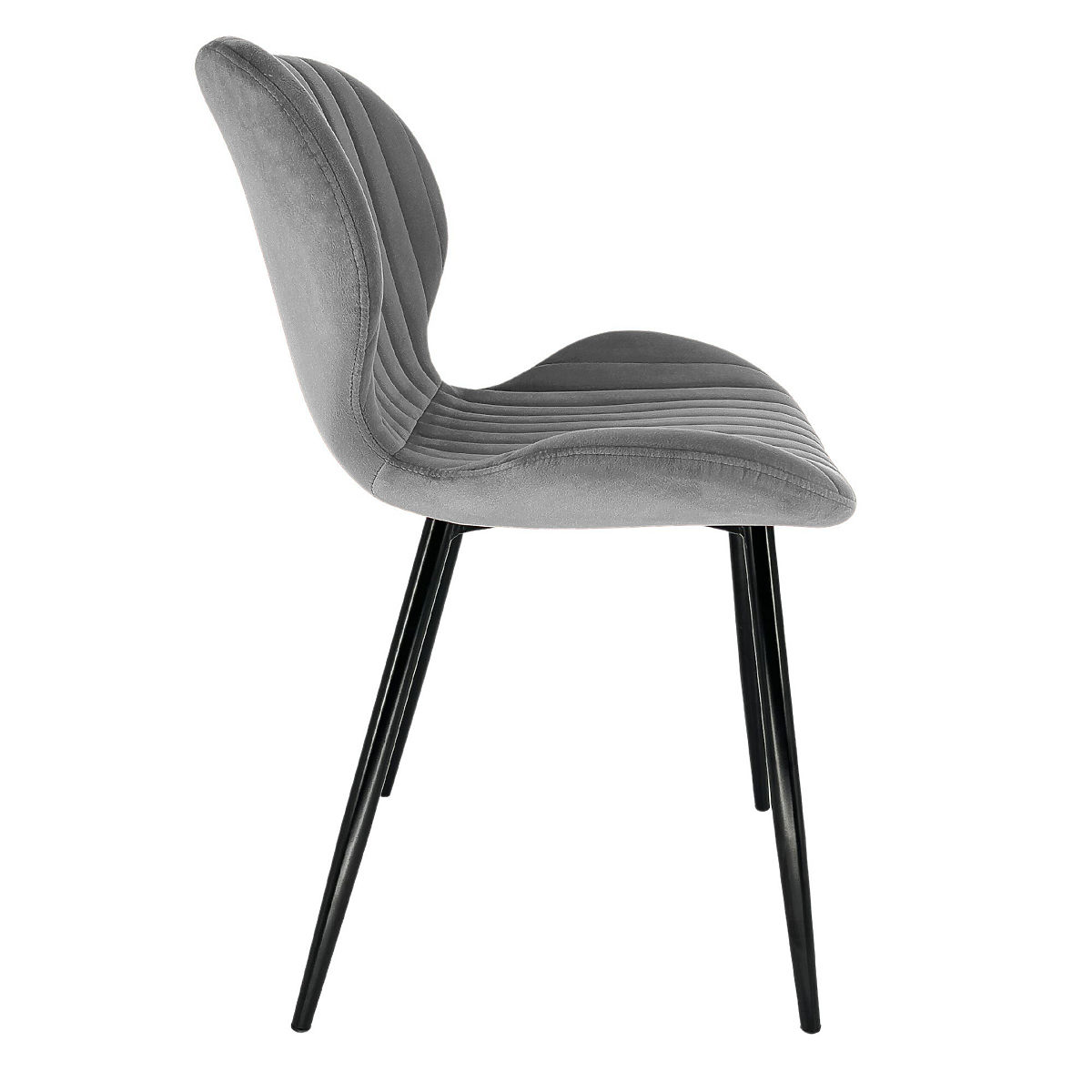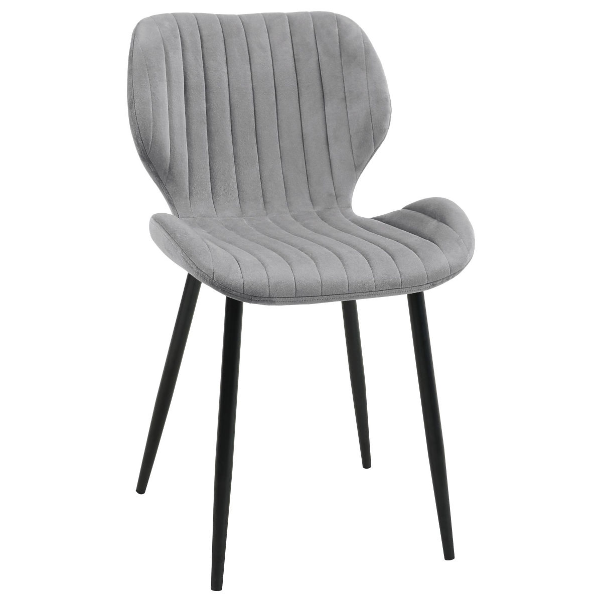 Gepolsterter Stuhl mit grauem Veloursbezug und schwarzen Metallbeinen. .. mehr