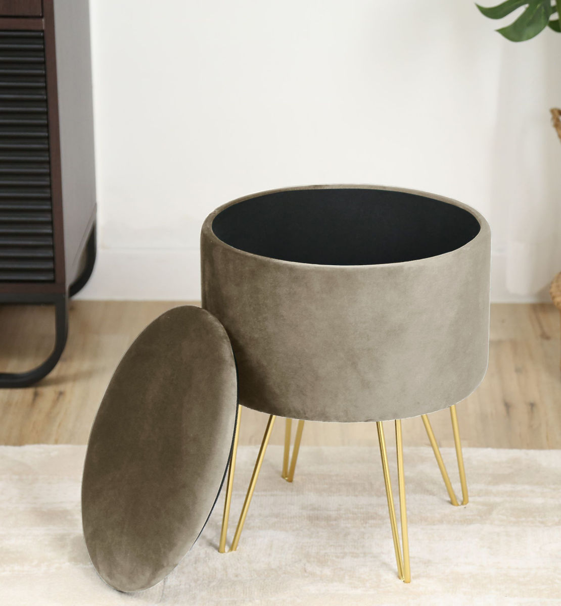 Ein Puff mit Stauraum auf Metallbeinen in goldener Farbe.