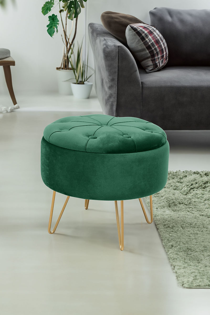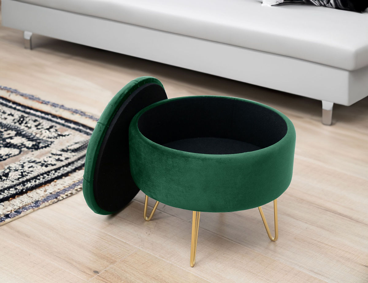 Ein Hocker oder Puff ist eine großartige Ergänzung für das Wohnzimmer oder Schlafzimmer. Dank ihm können müde Füße nach einem ganzen Tag des Gehens ausruhen, und wenn der Puff aus weichem Velours gefertigt ist, verstärkt dies nur das angenehme Gefühl der Entspannung. Das moderne Aussehen wird durch die mit goldener Farbe lackierten Metallbeine ergänzt, die dieses Jahr so modisch sind. Der aufklappbare Deckel bietet Zugang zum Stauraum, in dem Gegenstände aufbewahrt werden können, die nicht für den täglichen Gebrauch benötigt werden.Spezifikationen: