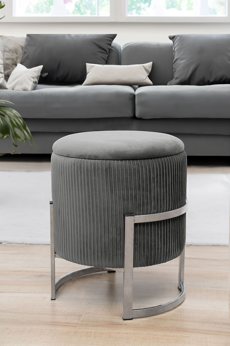Runder Puff mit Stauraum und silberner Metallbasis. .. mehr