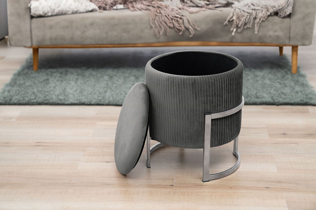 Puff mit Stauraum auf einer silberfarbenen Metallbasis.